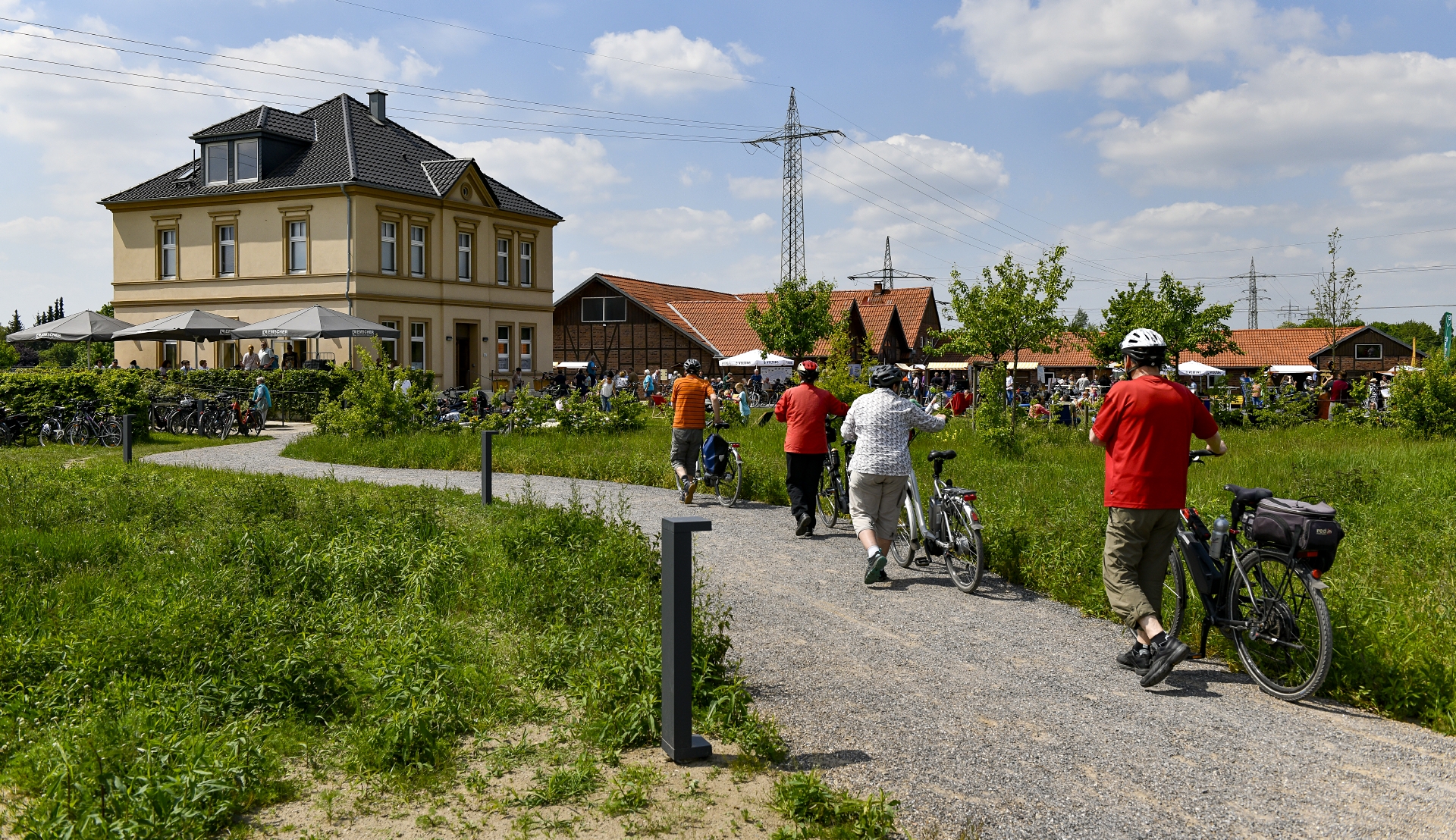 Der Hof Emscher-Auen ist als grüne Oase ein idealer Ort, um bei Radtouren entlang des Emscher-Wegs eine Pause einzulegen.