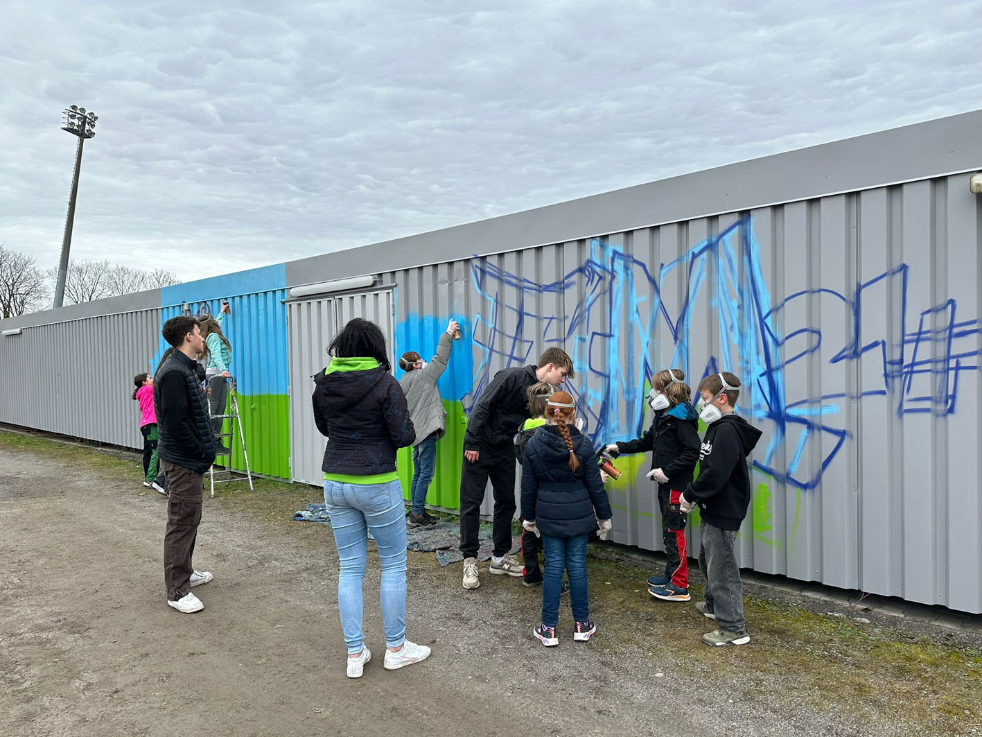 Kinder und Jugendliche gestalten in den Osterferien die Tribünenwand im Hemberg-Stadion. Sie soll für den Empfang der italienischen Nationalmannschaft verschönert werden, die im Juni ihr EM-Base Camp in Iserlohn aufschlägt.