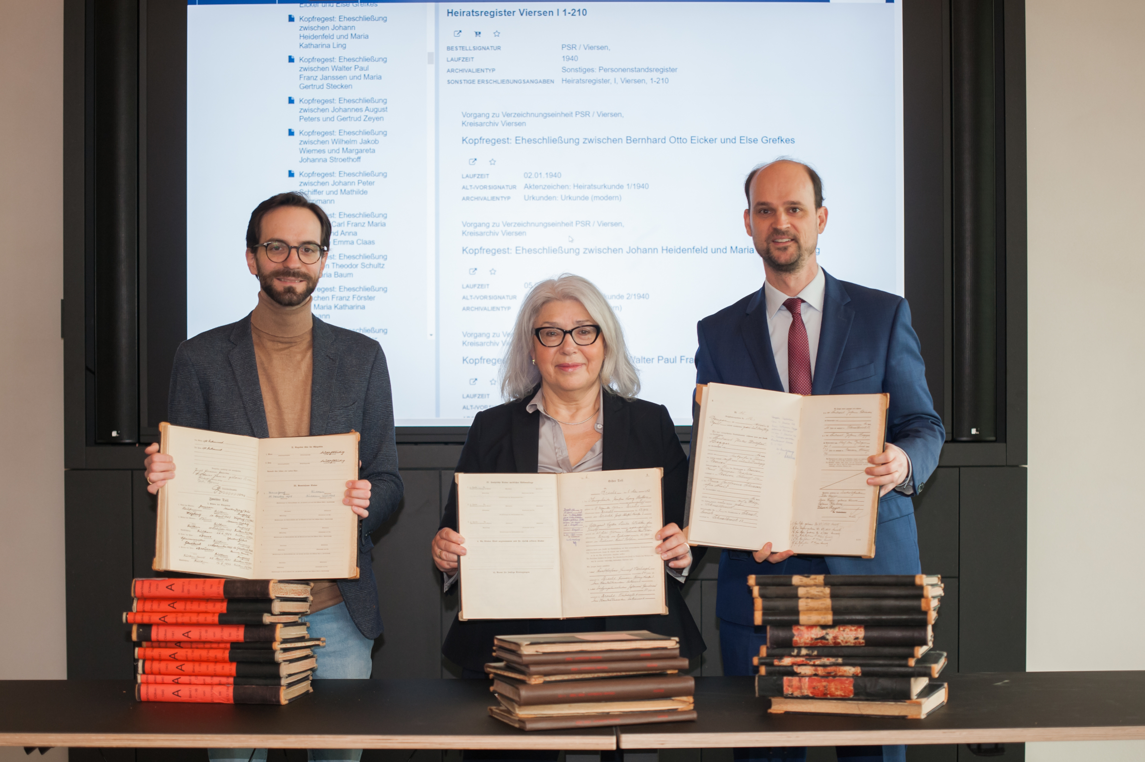 Stellen die digital erschlossenen Heiratsregister und Recherchemöglichkeiten vor: Dr. Matthias Herm, Ramona Vahle-Bonsels und Dr. Michael Habersack.