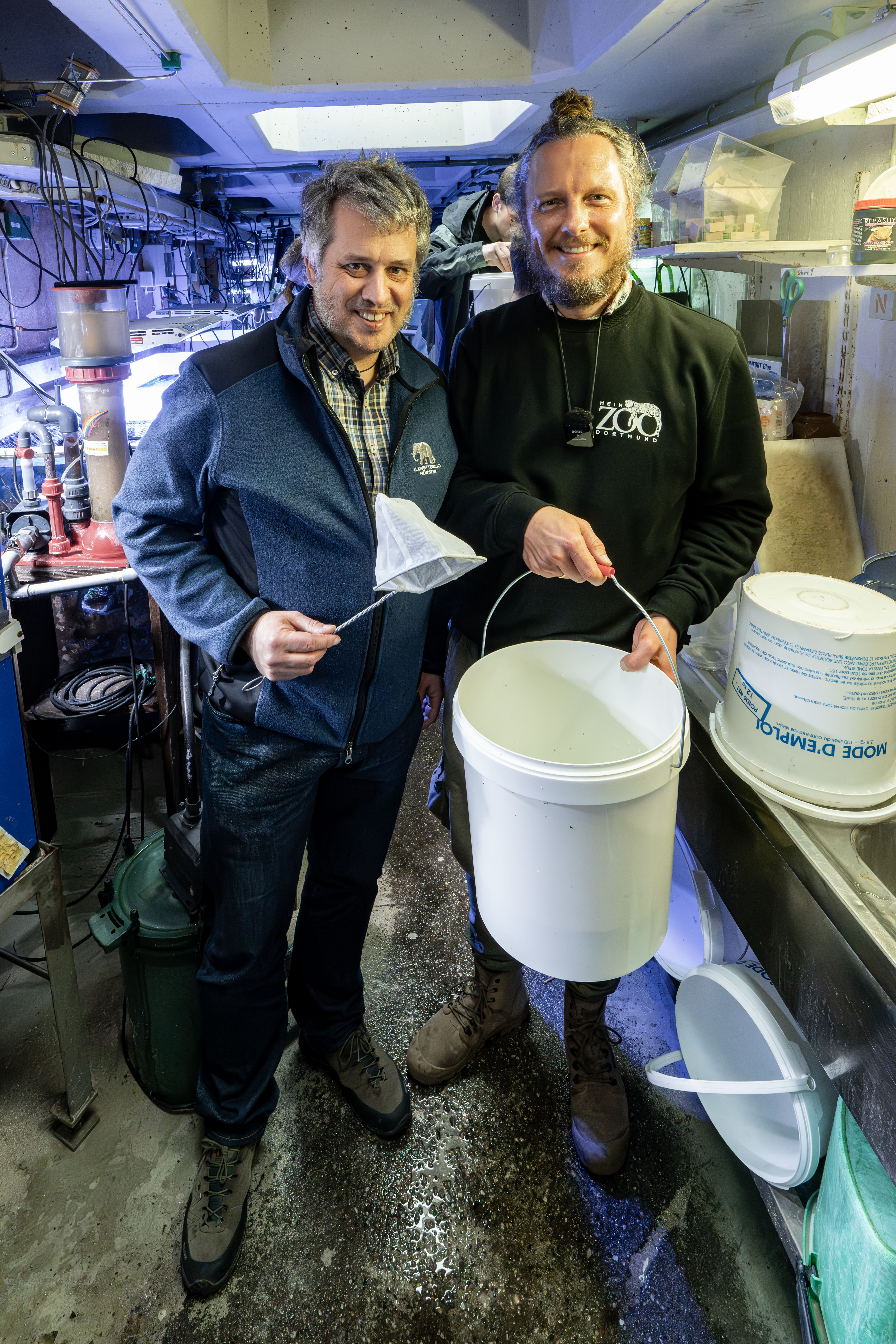 Dr. Philipp Wagner, Kurator für Artenschutz und Forschung im Allwetterzoo Münster und Marcel Stawinoga, Zoo Dortmund