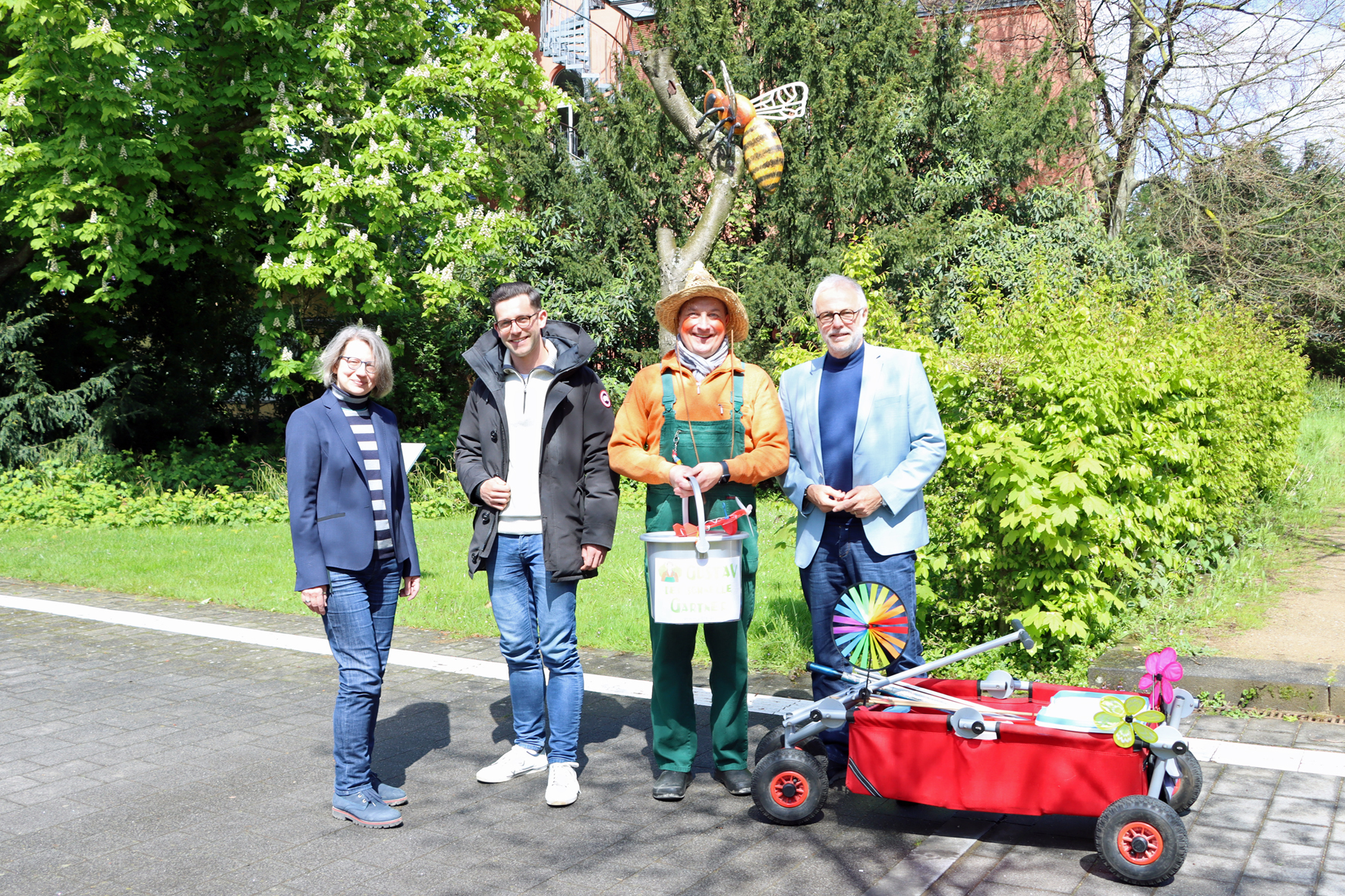 Brigitte Berkau von der Hertener Wirtschaftsförderung, Marlo Zurhausen vom Sportmanagement MZ, Eventkünstler Frank Hoffmann und Bürgermeister Matthias Müller freuen sich auf den Blumenmarkt in Herten.