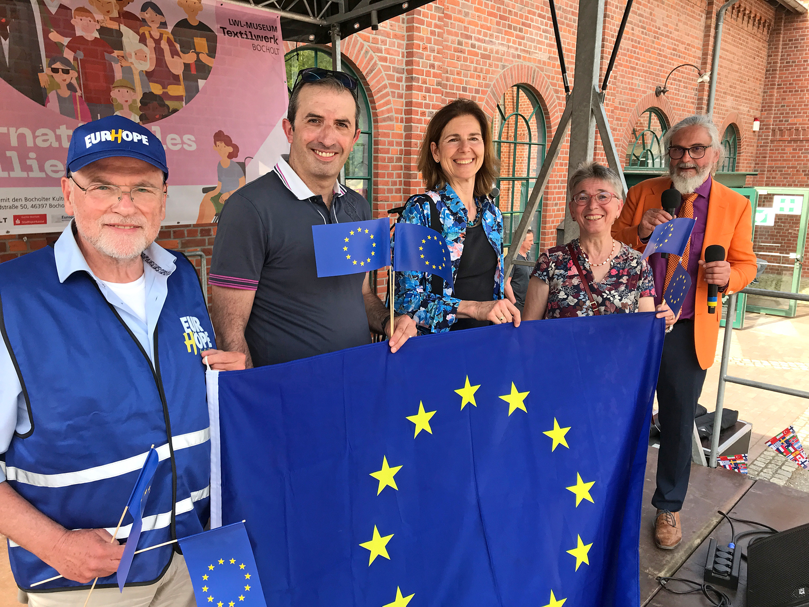 Diskutierten beim Familienfest am 1. Mai über europäische Werte (v.l.n.r.): Peter W. Wahl (Europaunion), Juan Lopez Casanava (Integrationsratsvorsitzender), Sonja Wießmeier (Europe-Direct Bocholt) und Gudrun Koppers (stv. Bürgermeisterin und Mitglied im Integrationsrat) - Foto: Bruno Wansing