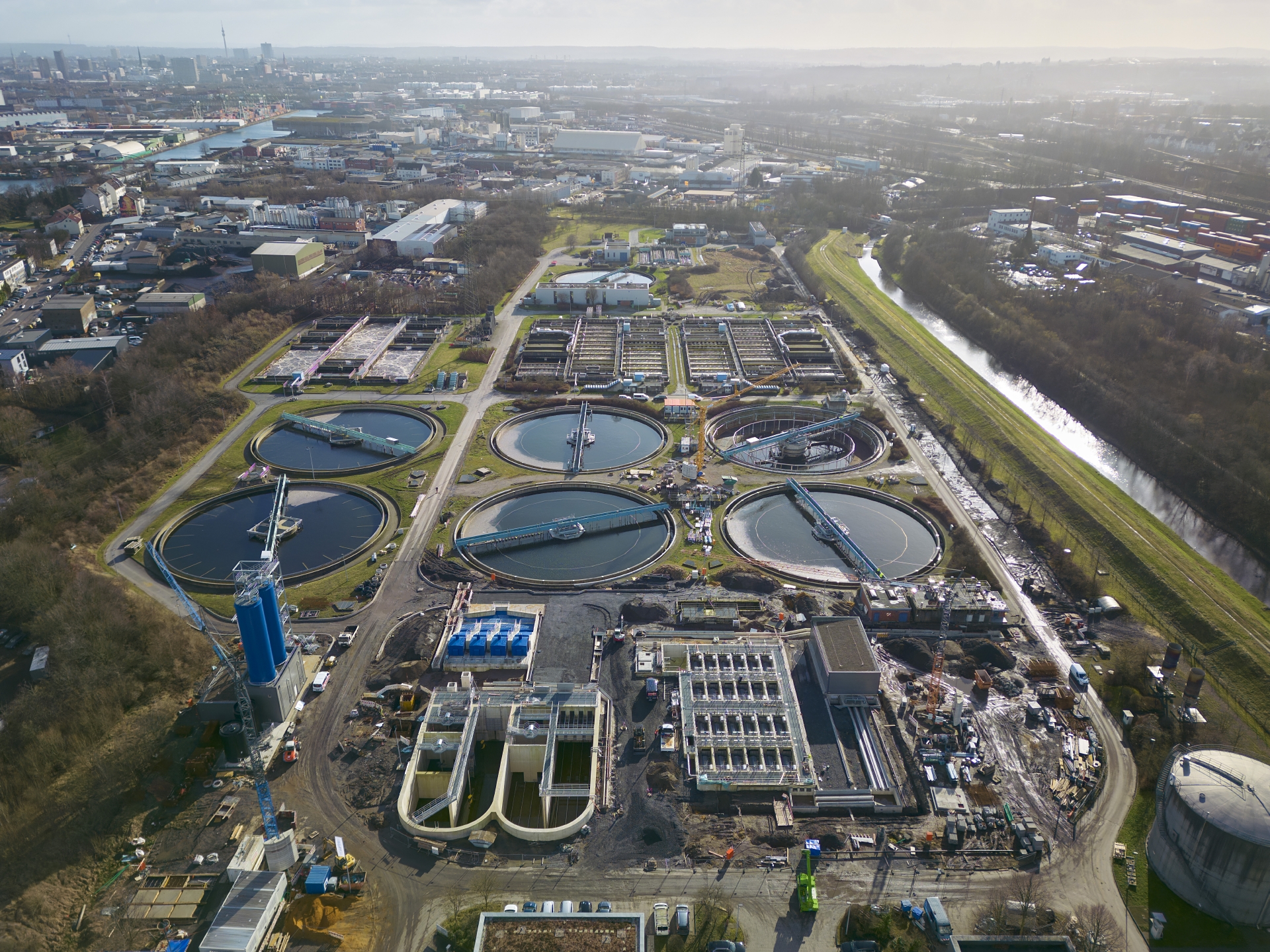 Die Kläranlage der Emschergenossenschaft in Dortmund-Deusen wird aktuell mit der 4. Reinigungsstufe ausgerüstet. Das Foto stammt von Anfang Februar 2024.