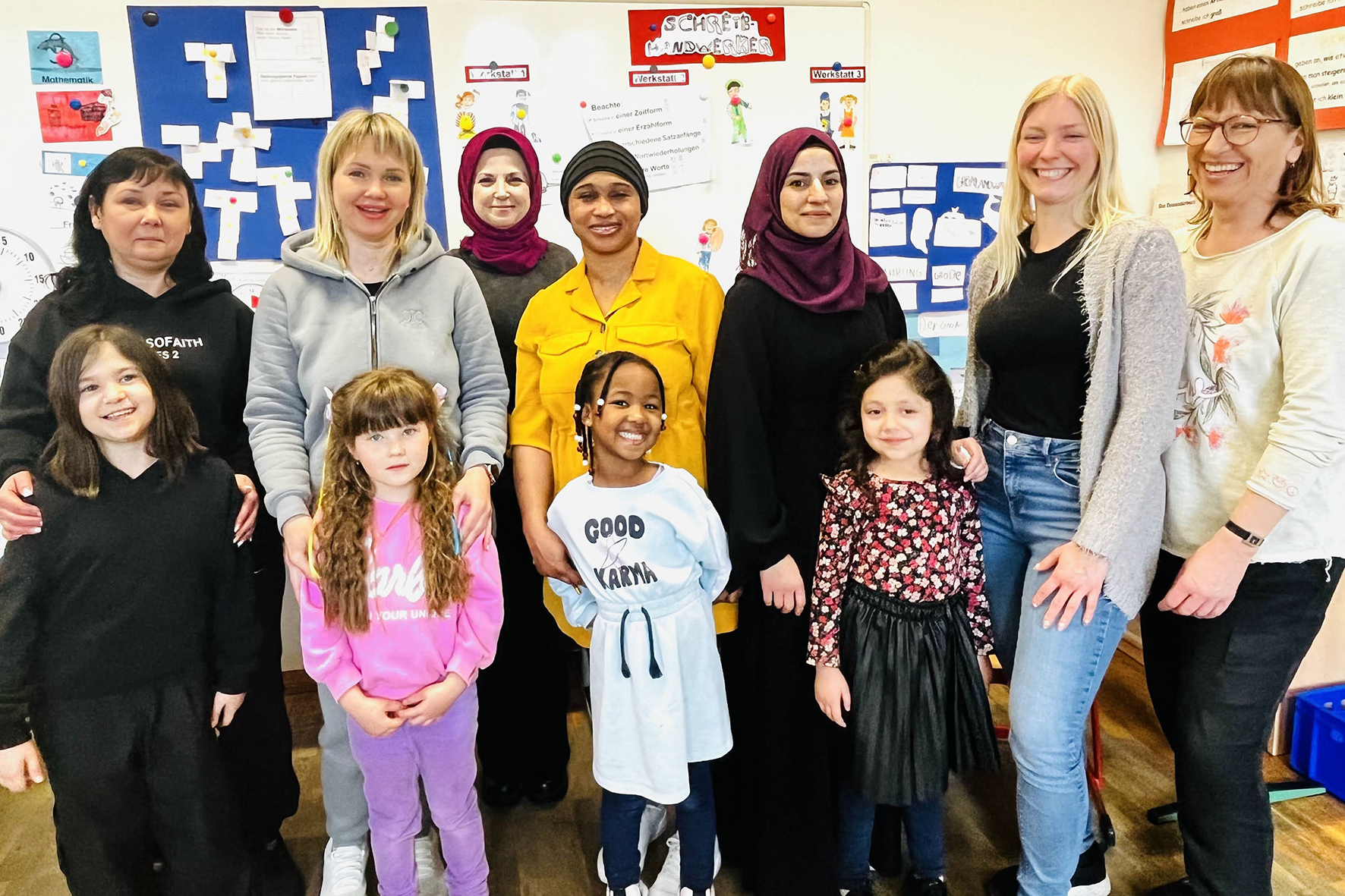 Teilnehmerinnen des Kurses mit Deutschlehrerin Yasemin Cakiroglu (hinten, 3. v. l.) und Regina Weyer (r.), Mitarbeiterin des Projektes "Ein Quadratkilometer Bildung" an der Waldschule in Herten-Langenbochum. (Foto: Stadt Herten/Christine Fester)