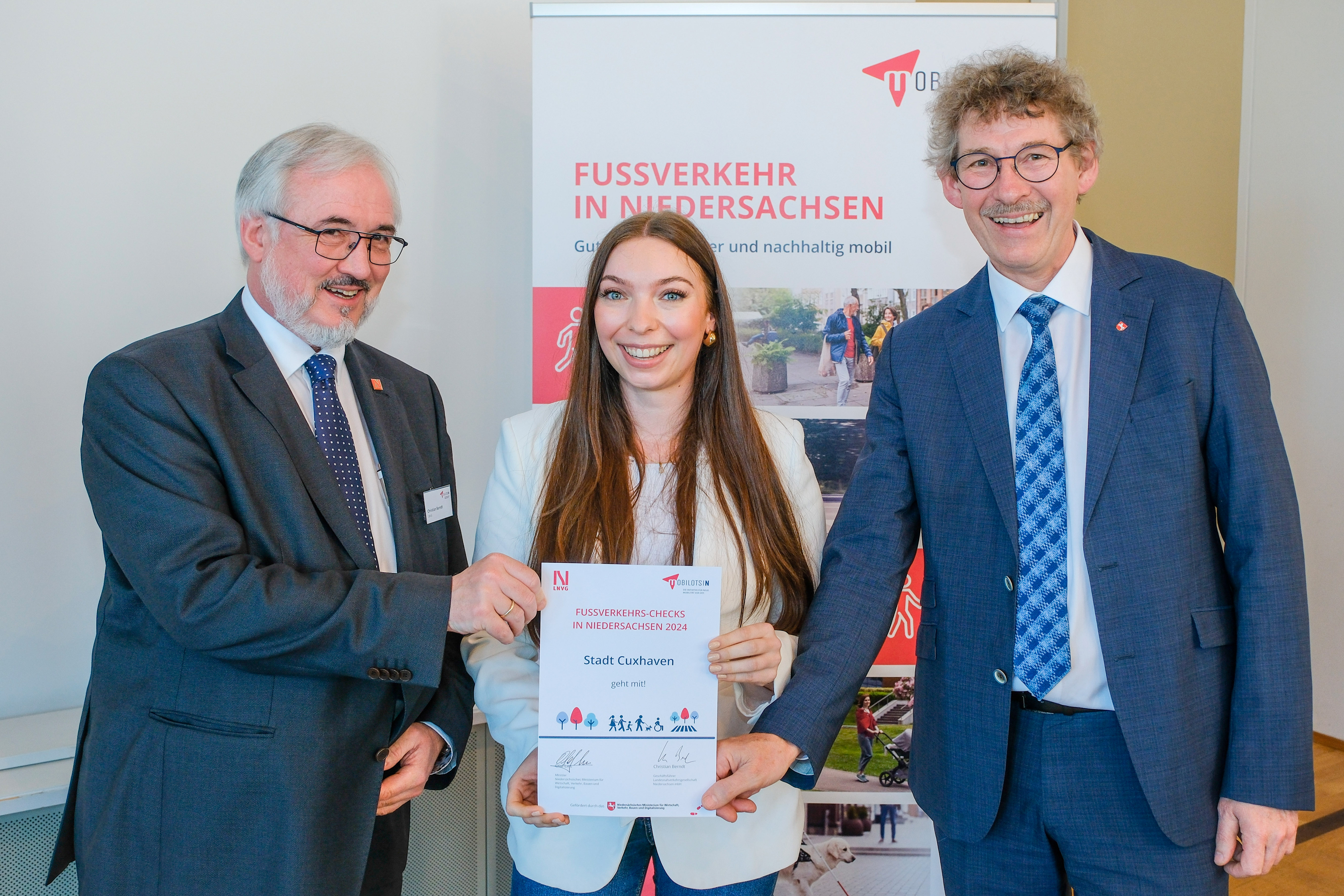 Medienarchiv Staatssekretär Frank Doods und Christian Berndt, Geschäftsführer der Landesnahverkehrsgesellschaft, gratulieren Denise Wächter zum Fußverkehrs-Check in der Stadt Cuxhaven. Foto: LNVG/Schulze