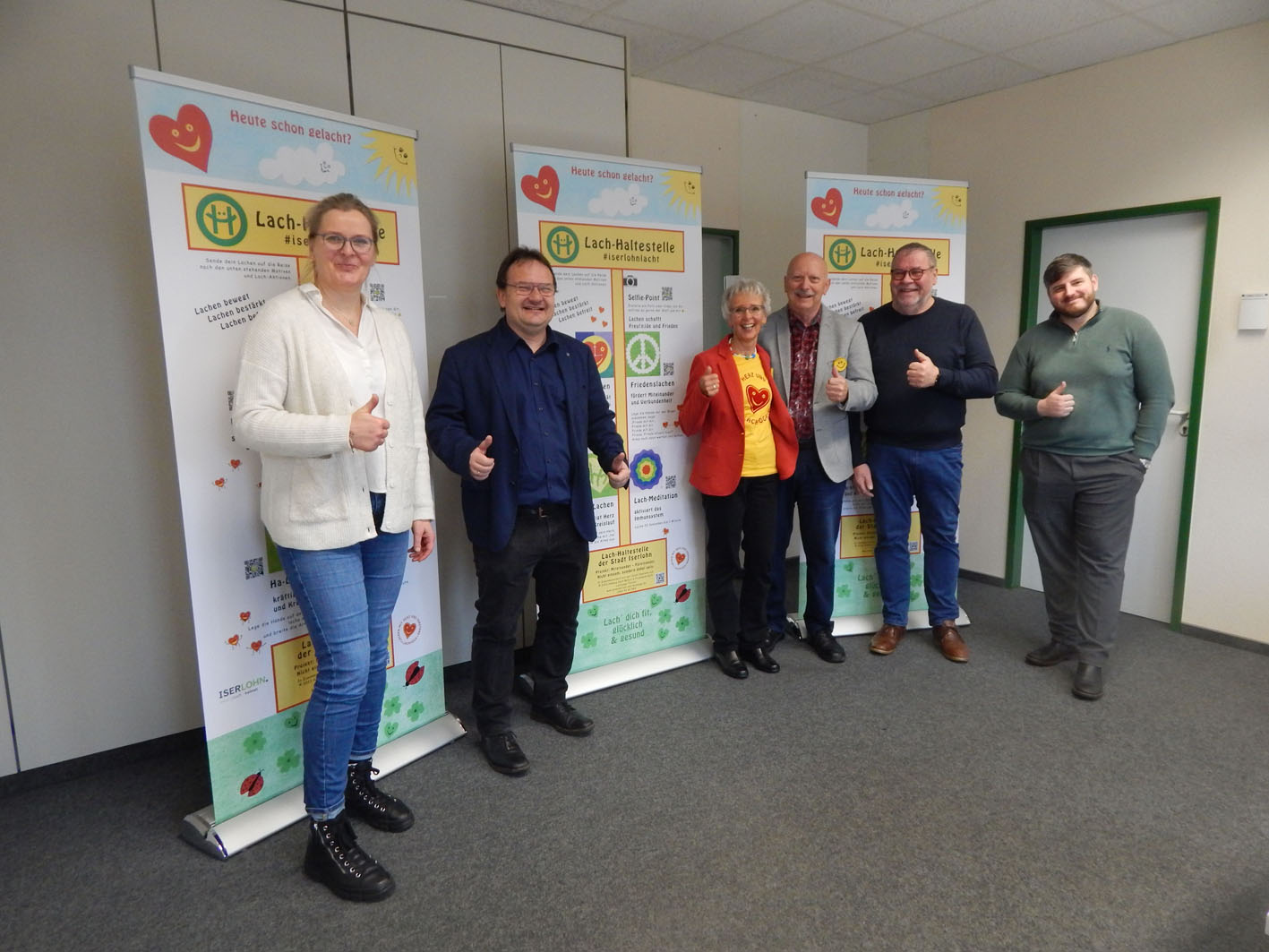 Werben für die mobile Iserlohner Lach-Haltestelle (v.l.): Tatjana Hegmann-Thomas (Projekt „Endlich ein ZUHAUSE“), Hinrich Riemann (Servicestelle Ehrenamt), Lachyoga-Trainerin Hedwig Koch-Münch und Lachyoga-Trainer Friedhelm Koch (Erfinder der Lach-Haltestelle), Rainer Bormann (Seniorenbeirat) und Julian Versen („Continue“).