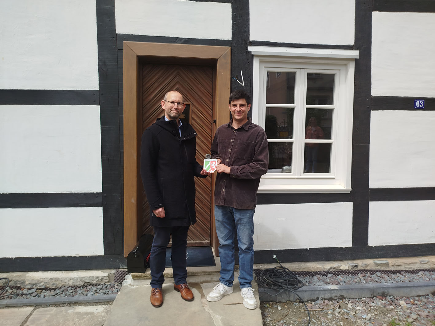 Stadtbaurat Thorsten Grote (l.) überreicht die Denkmalplakette für das Alte Pfarrhaus Oestrich an Eigentümer Johannes Kissing.