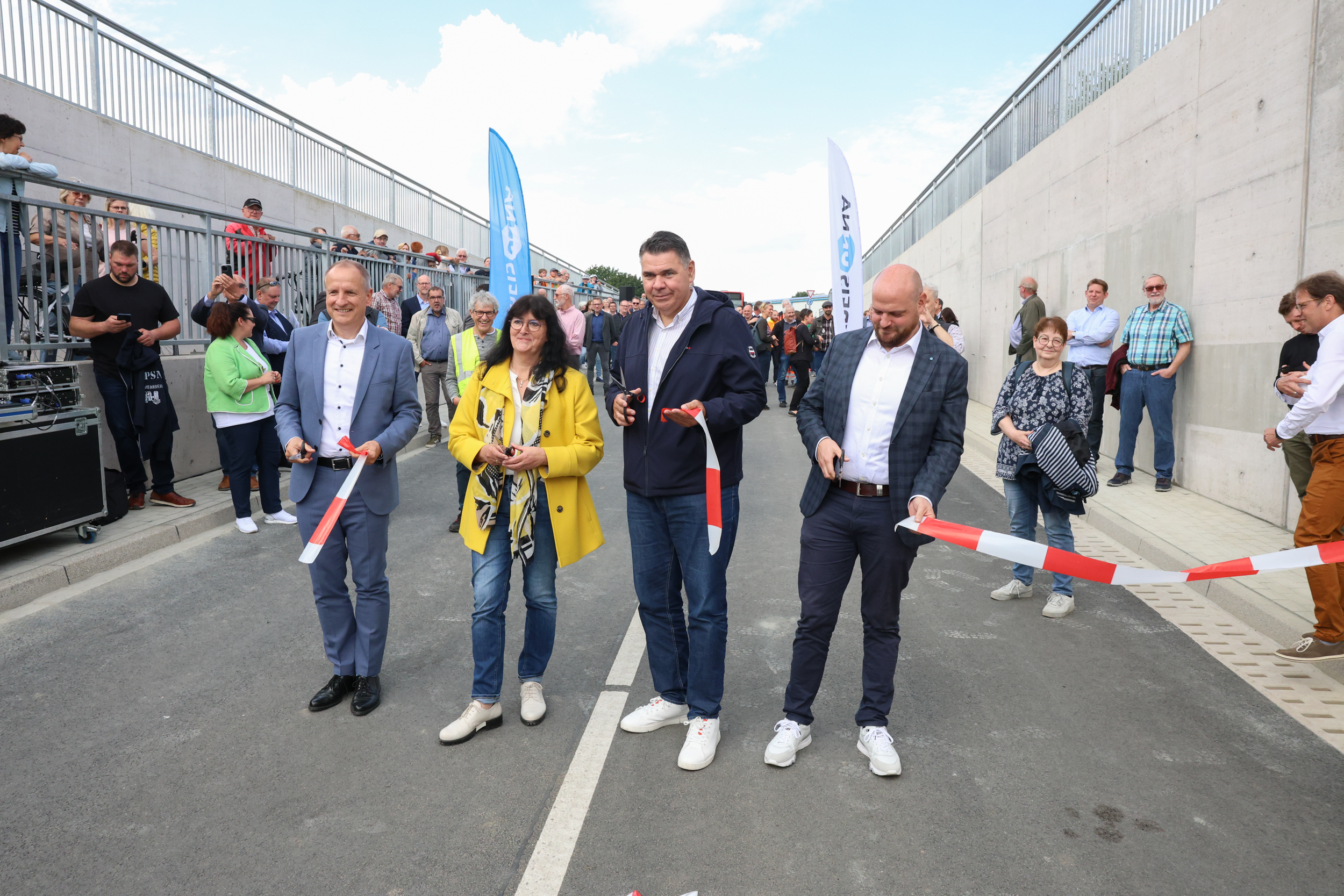 Bildzeile 1: Durchschnitten das Band und gaben die Straße frei: Landrat Mario Löhr (2.v.r.), Dr. Marcus Schenkel von der DB InfraGO AG (l.), Kamens Bürgermeisterin Elke Kappen (2.v.l.) und Baudezernent Adrian Kersting (r.).