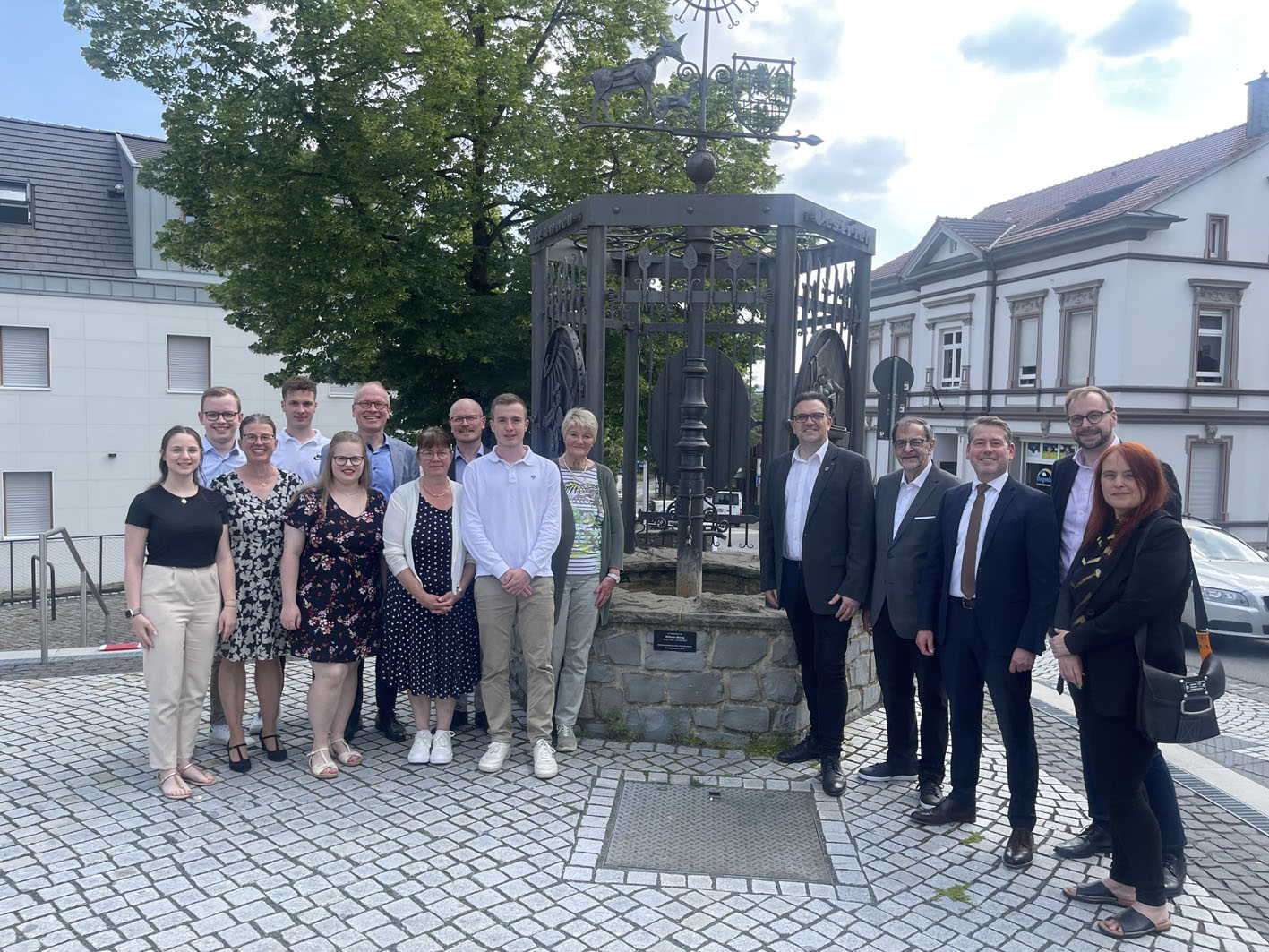 Mitglieder der Familie Mönig (links), Bürgermeister Michael Joithe und Vertreter der Fraktionen von CDU und SPD kamen in Oestrich zusammen, um in einer Feierstunde den Ehrenvorsitzenden des Heimatvereines Ortsring Oestrich Wilhelm Mönig mit einer Gedenktafel zu ehren.