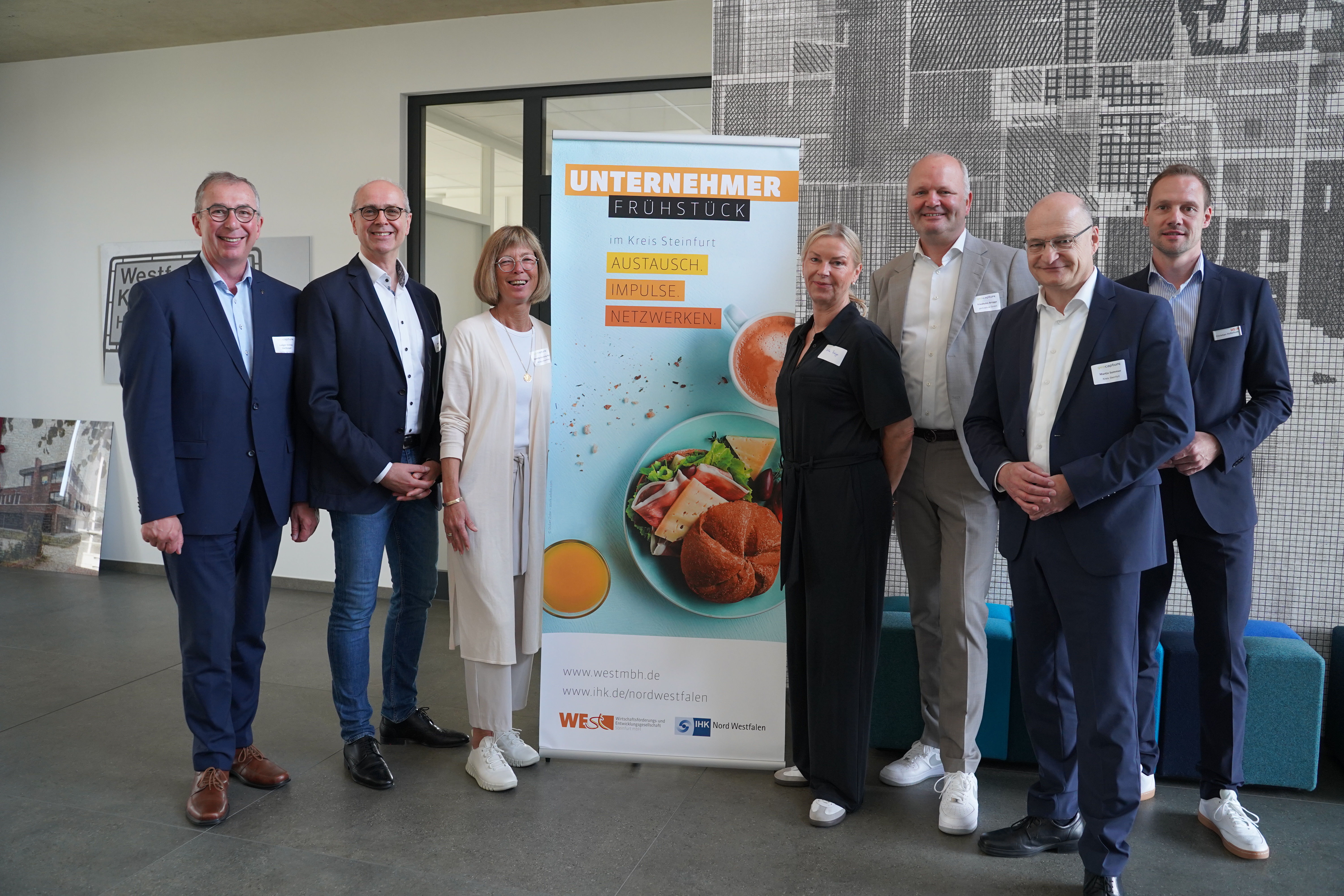 Beim 36. kreisweiten Unternehmerfrühstück dabei (v.l.): Ludger Kleine-Harmeyer (Bürgermeister Hopsten), Matthias Martin, (stellvertretender Vorsitzender des IHK-Regionalausschusses für den Kreis Steinfurt), Dorothe Hünting-Boll (IHK-Regionalbeauftragte für die Kreise Steinfurt und Warendorf), Ursula und Friedhelm Brügge (geoCapture), Dr. Martin Sommer (Landrat des Kreises Steinfurt) und Christian Holterhues (WESt-Geschäftsführer).
