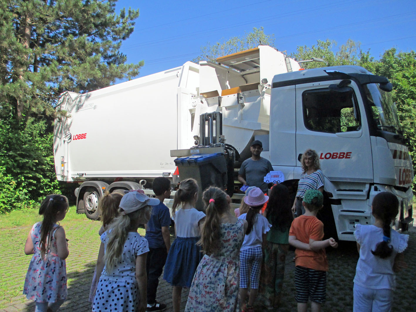 Lobbe-Mitarbeiter Ayhan Elik erklärte den „Kleinen vom Erbenberg“ das mitgebrachte Müllfahrzeug und beantwortete den staunenden Kids alle Fragen zum Thema Müll.