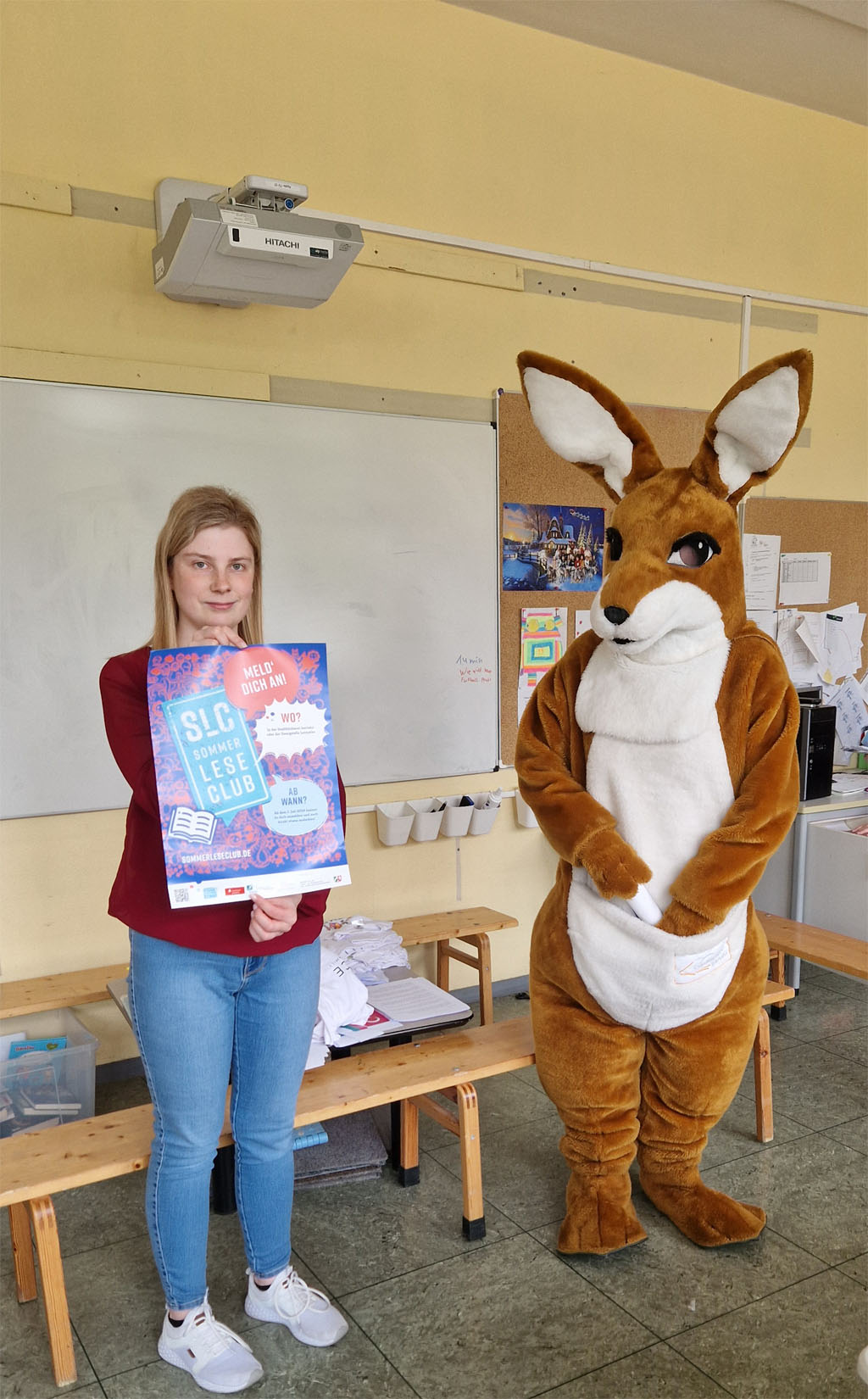 Kessy, das Lesekänguru, und Büchereimitarbeiterin Silvana Heise besuchten die Grundschule Sümmern und warben für den diesjährigen Sommerleseclub.