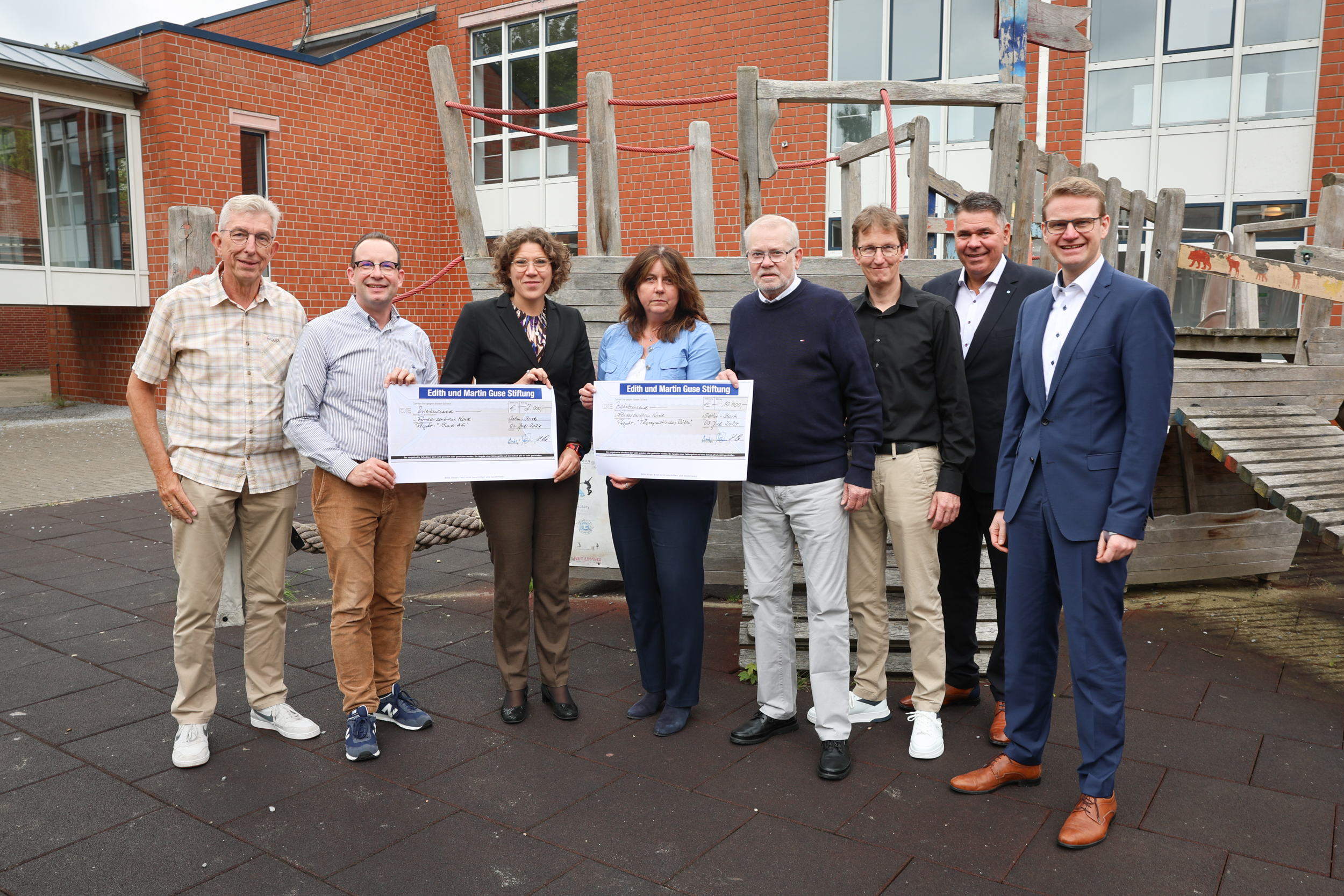 Von links: Lothar Pott (Vorstand Guse-Stiftung), Jens Möller (Kuratorium Guse-Stiftung), Bildungsdezernentin Dr. Katrin Linthorst, Fachbereichsleiterin Schulen und Bildung Anja Seeber, Gerhard Knüpp (Vorstandsvorsitzender Guse-Stiftung), Kay Eckebrecht (Schulleiter Förderzentrum Nord), Landrat Mario Löhr und Stefan Beckmann (Guse-Stiftung) bei der Spendenübergabe.