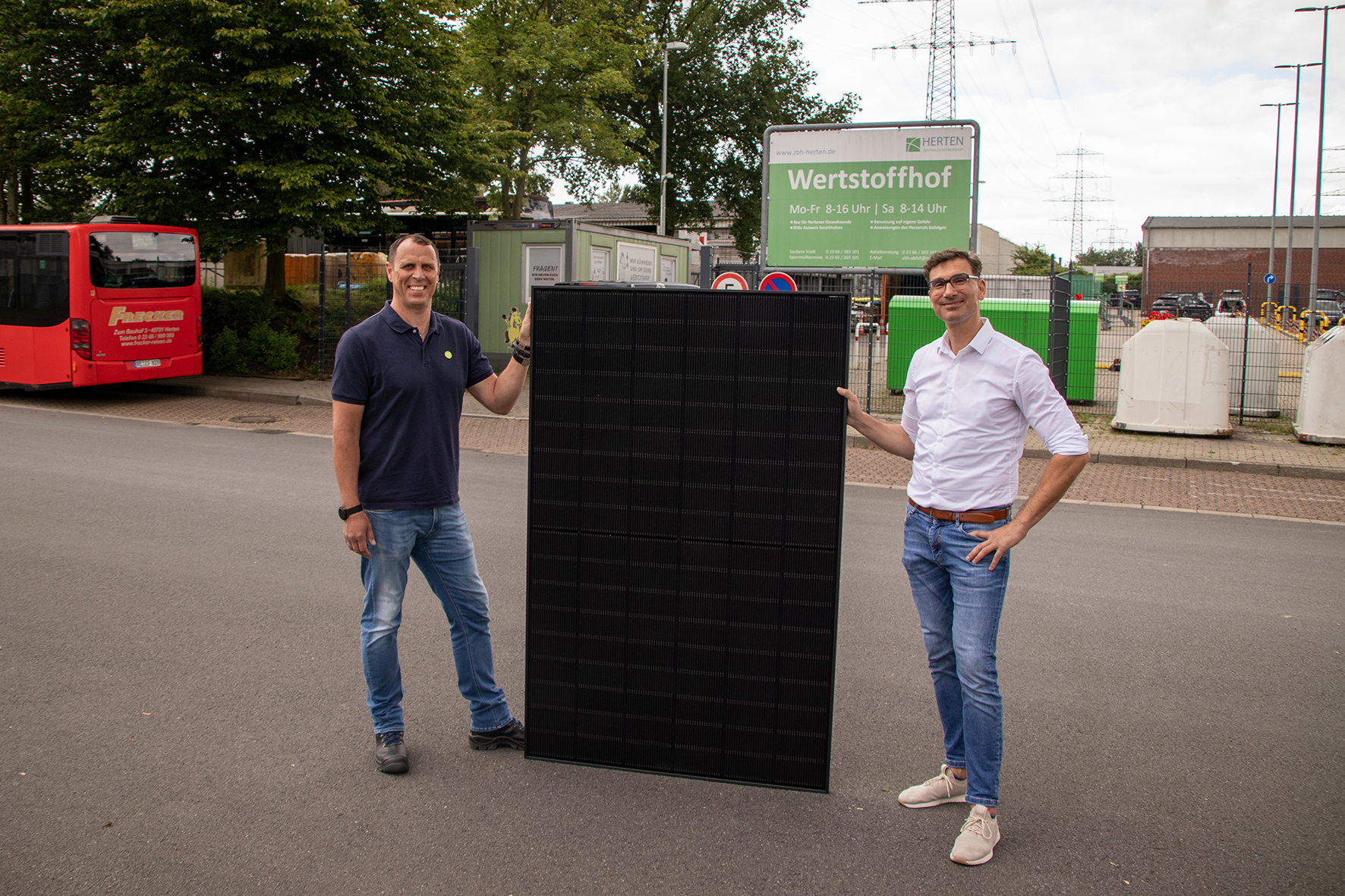 ZBH-Betriebsleiter Gregor Born (l.) und Evangelos Kamarakis, Leiter der Abteilung Energiedienstleistungen bei den Hertener Stadtwerken, freuen sich über die Inbetriebnahme des neuen 240-Kilowattpeak-Sonnenkraftwerks. (Foto: Hertener Stadtwerke_Jan Ahlers)