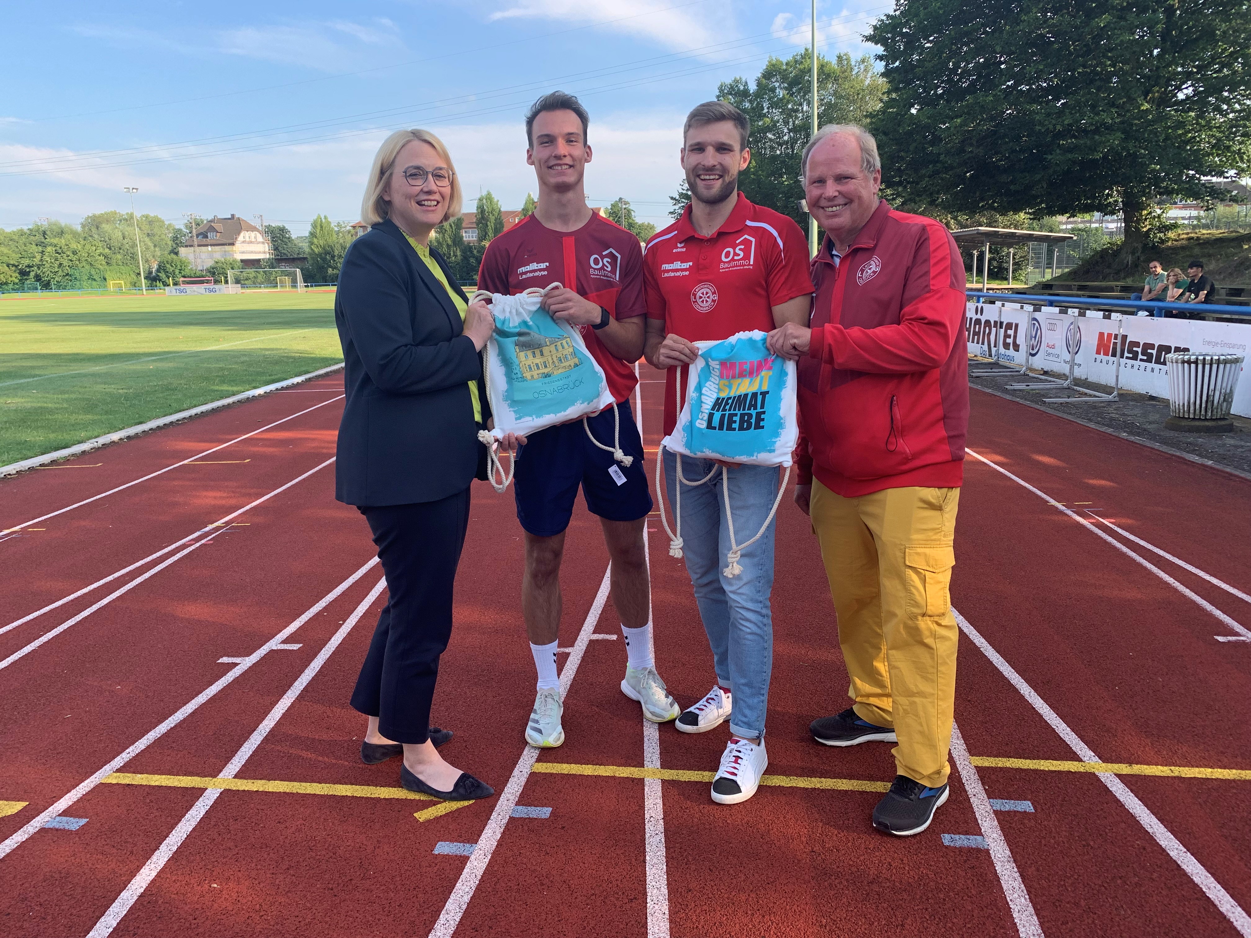 Vor der Abreise stattete Oberbürgermeisterin Katharina Pötter (links) Fabian Dammermann (2.v.r.) sowie seinem Trainingspartner und deutschen U23-Meister Florian Kroll (2.v.l.) und dem Trainer der beiden, Anton Siemer, einen Besuch ab und überreichte ein kleines Präsent der Stadt. Frieda Bühner, Pia Greiten und Leonie Meyer waren derweil auf Länderspielreise beziehungsweise im Trainingslager.