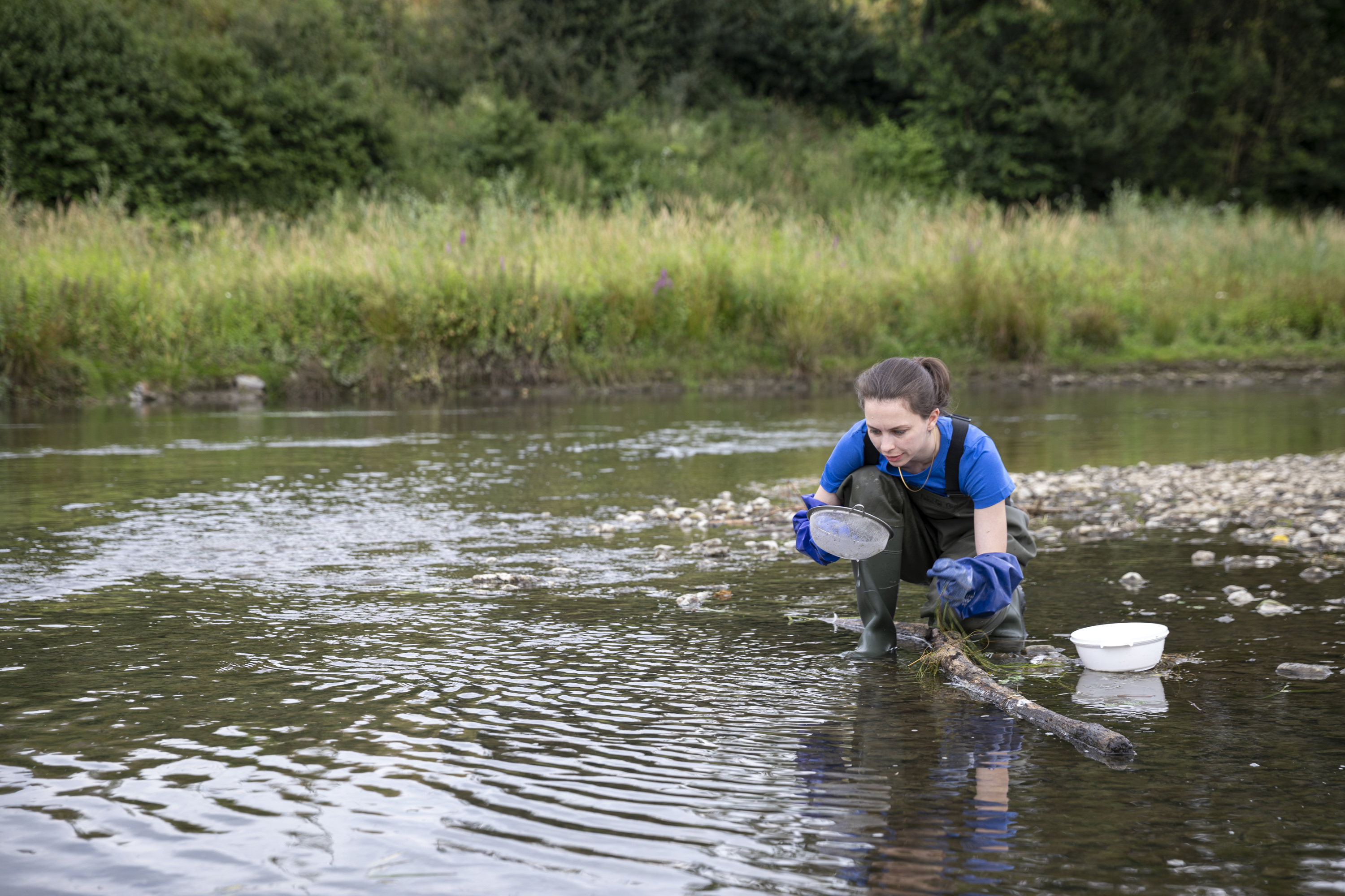 Jede Tier- und Pflanzenart hat ganz verschiedene Bedürfnisse und Anforderungen an ihren Lebensraum. Manche Arten leben im Wasser, manche mögen lieber die Auenbereiche der Gewässer, die nur zeitweise unter Wasser stehen. Die Forschenden begaben sich daher nicht nur an, sondern auch in die Gewässer (hier die Emscher), um möglichst viele Arten ausfindig zu machen.