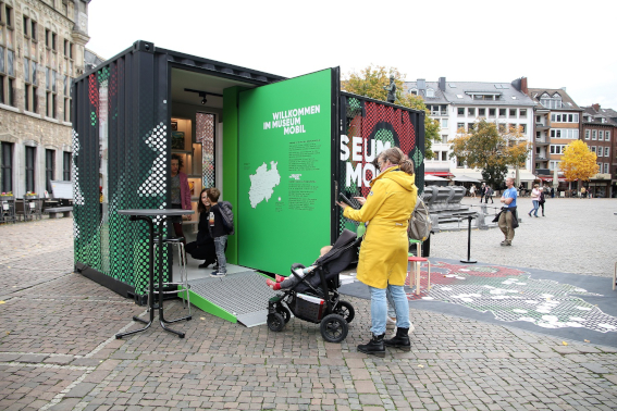 Museum-Mobil-Container mit Ausstellung zur Geschichte des Landes NRW, hier in Aachen.
