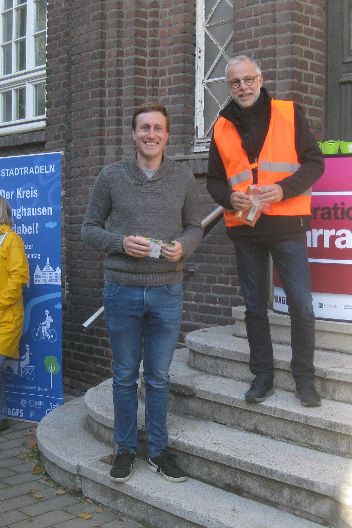 Auch zum Ende des Stadtradelns 2024 in Herten wird es wieder attraktive Preise – wie hier 2022 überreicht durch Bürgermeister Matthias Müller (r.) – geben. Herrn Willeke als Vertreter des Teams „Radelmäuse“ vom Förderverein der Kita St. Josef Disteln nimmt einen Gutschein entgegen (Foto: Stadt Herten_Lydia Schäfers).