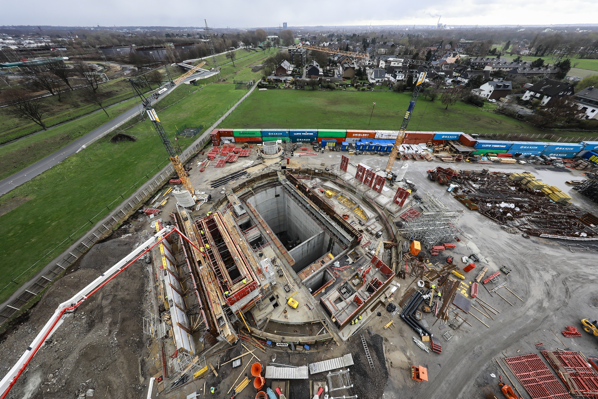 Der Bau von Deutschlands größtem Schmutzwasserpumpwerk begann bereits im Frühjahr 2016 - diese Aufnahme zeigt den Fortschritt der komplexen Bauarbeiten auf engstem Raum im Jahr 2019.