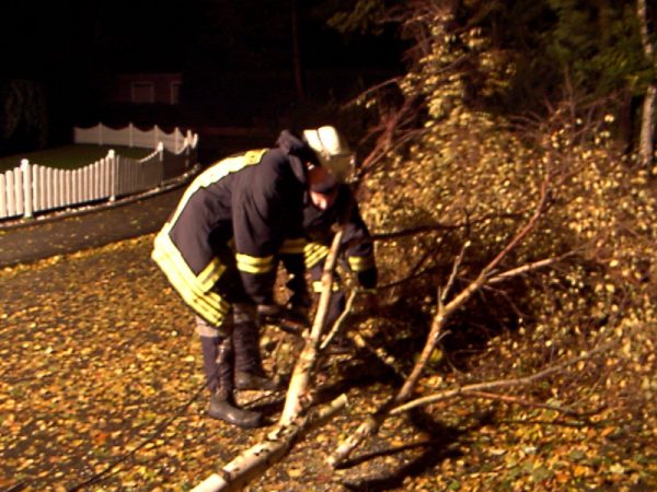 Eine abgebrochene Birkenspitze wird von der Straße geräumt