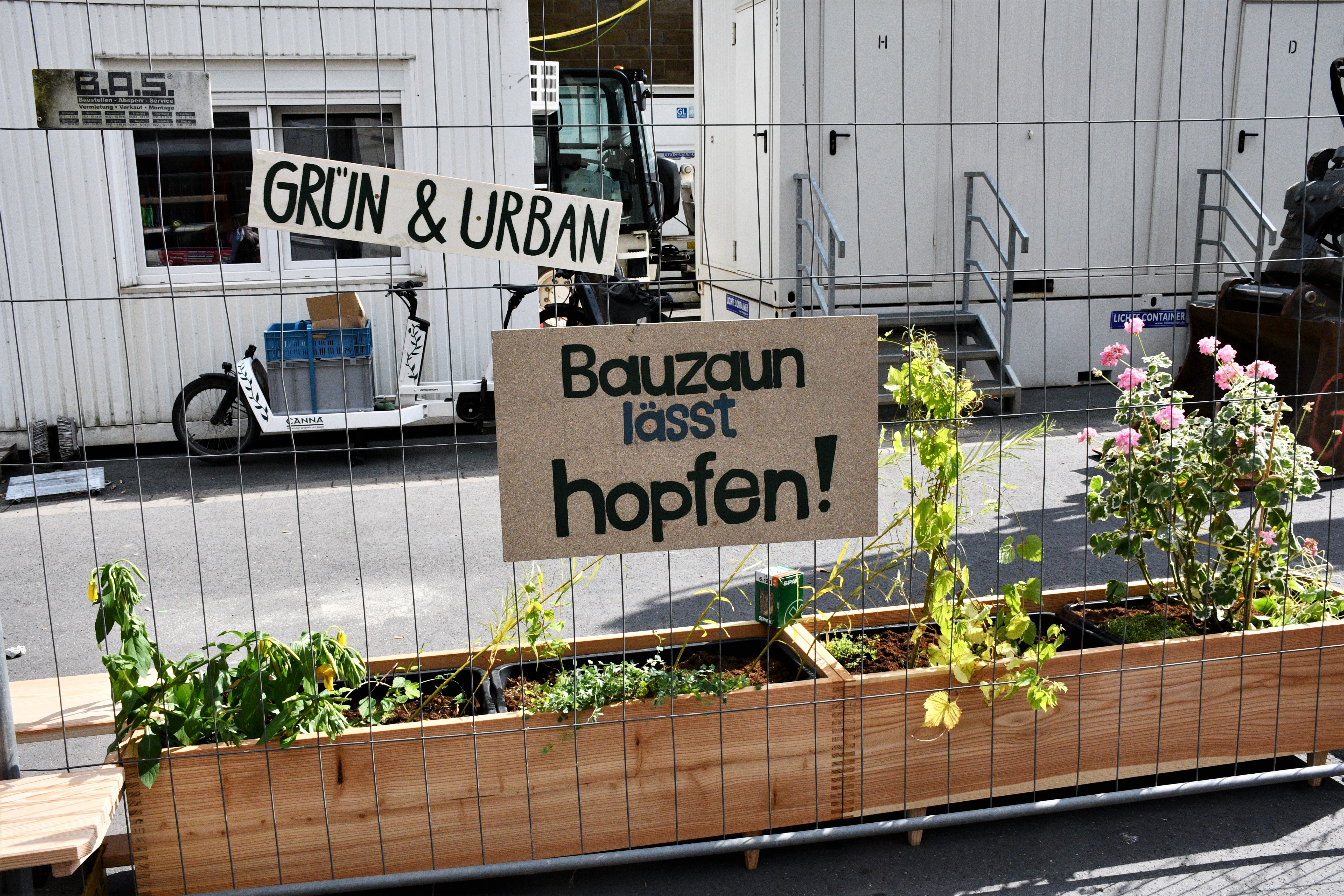 Die frisch eingesetzten Pflanzen, insbesondere der Hopfen, werden in wenigen Wochen schon ein üppiges Bild abgeben.