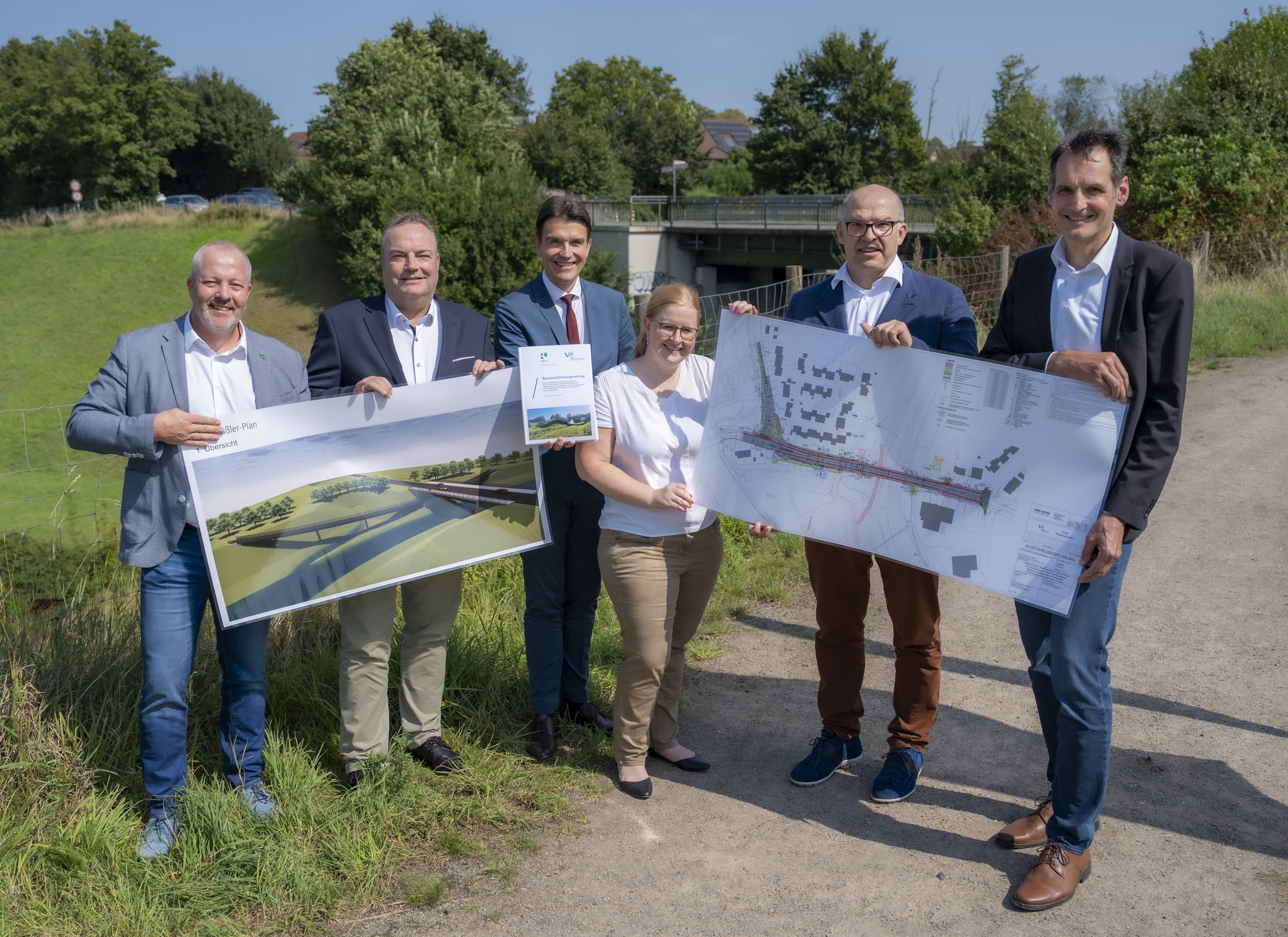 V.l.n.r.: Carsten Uhlenbrock (Kreis RE), Landrat Bodo Klimpel, Prof. Dr. Uli Paetzel (EG), Marieke Averdung (Kreis RE), Peter Haumann (Kreis RE) und Markus Kühnel (EG) präsentieren Grafiken und Zeichnungen der neuen Brücke sowie den vor Ort unterzeichneten Baudurchführungsvertrag. Im Hintergrund ist die Emscher-Brücke Wartburgstraße (K28) zu sehen, um die es geht.