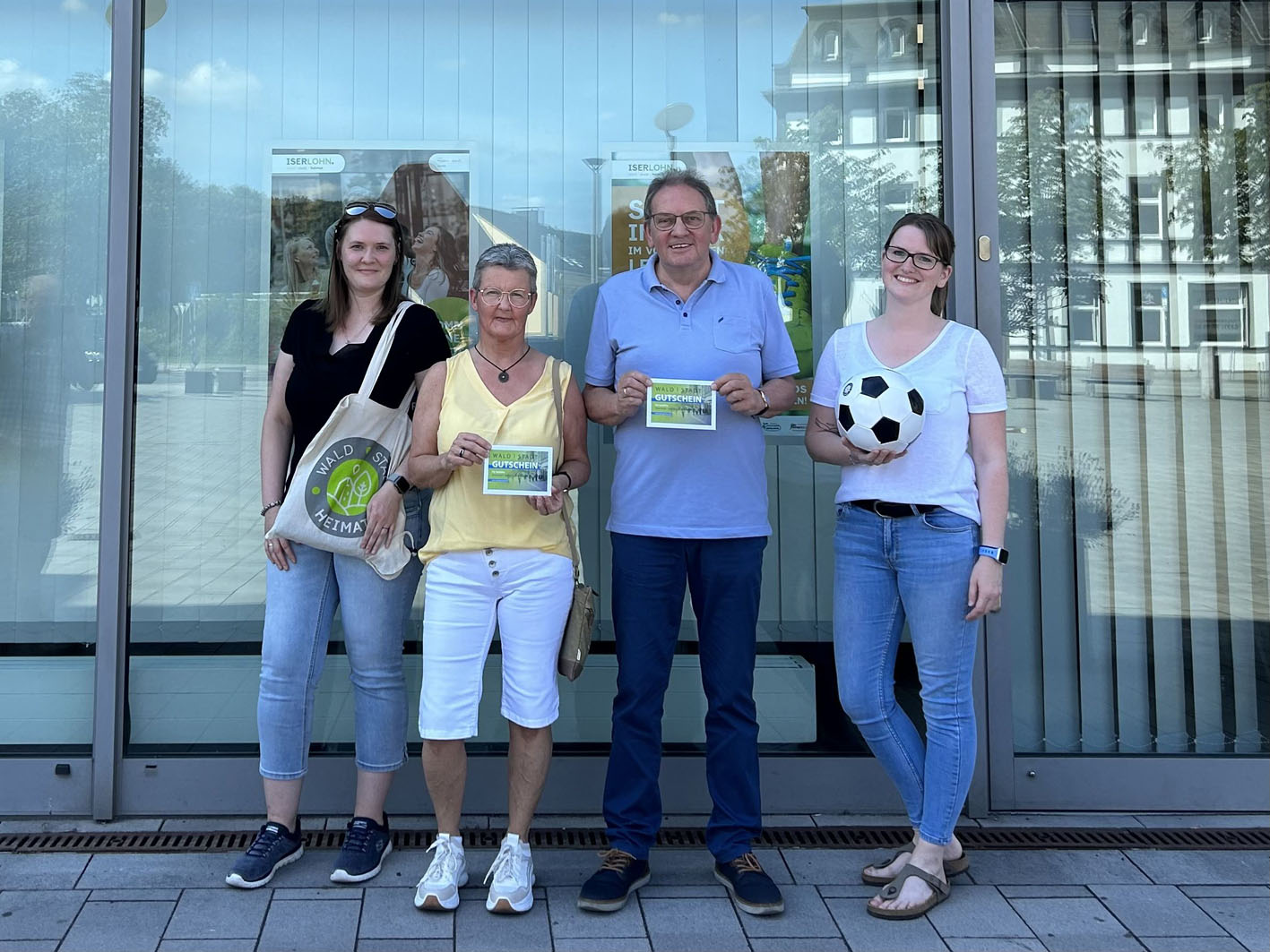 Waren beim EM-Gewinnspiel erfolgreich (v.l.) Anja Daute, Birgit Buchholz und Michael Schlippe. Es fehlt Nadja U. Pesch. Kristina Zander vom Stadtmarketing Iserlohn (r.) überreichte die Preise.