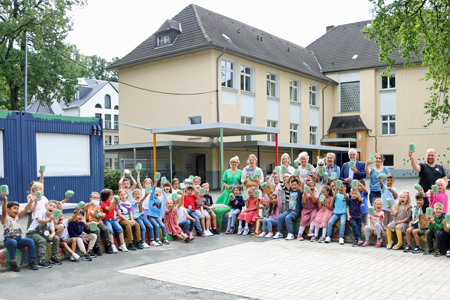 Brotdosen für die Kinder der ersten Klassen: Hertens Bürgermeister Matthias Müller überreichte gemeinsam mit Mitarbeiterinnen des ZBH Brotdosen an die Erstklässlerinnen und Erstklässler der Barbaraschule.