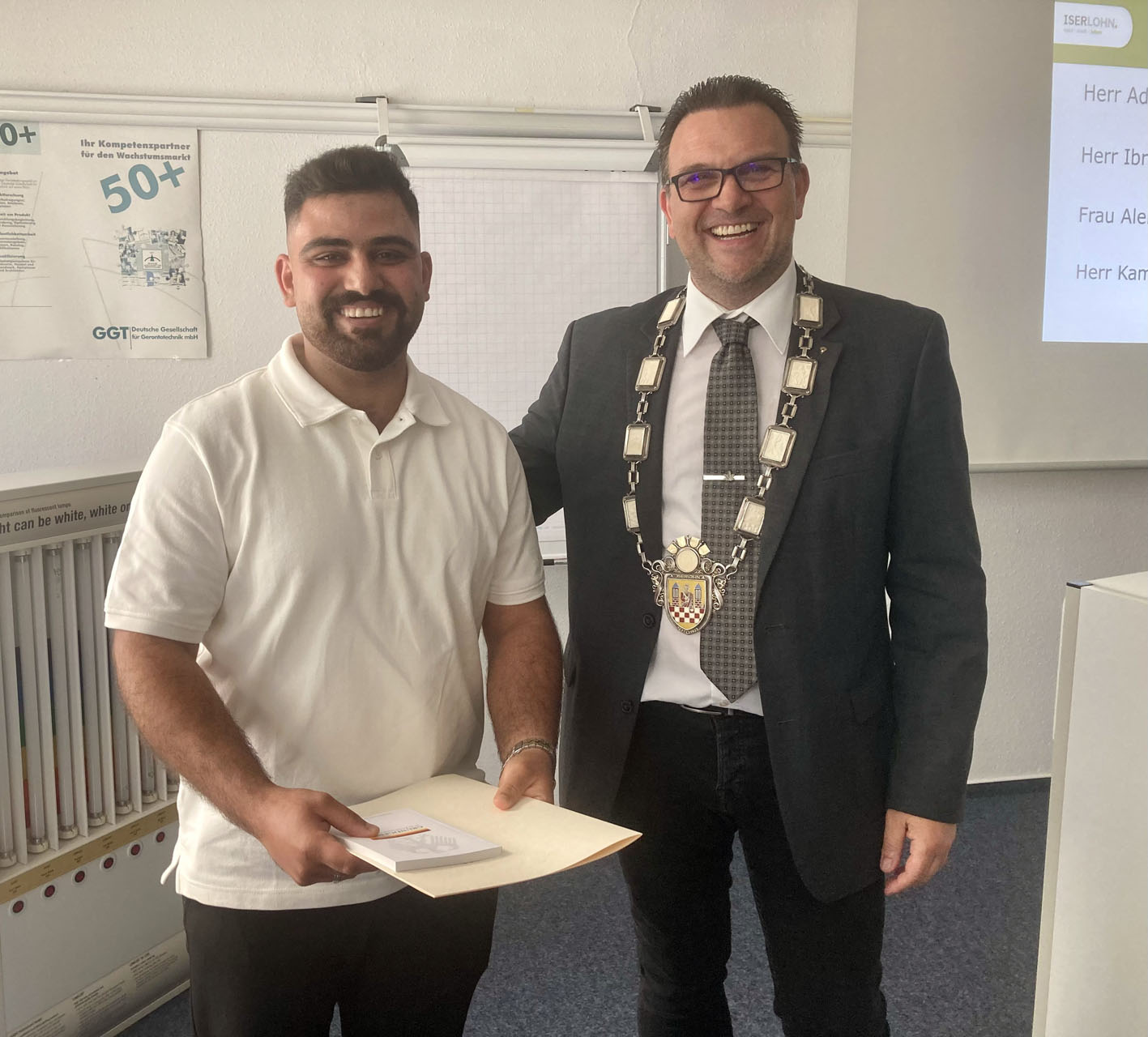 Bürgermeister Michael Joithe mit Neubürger Ibrahim Alrshedat, der nach dem Erhalt der Einbürgerungsurkunde spontan eine kleine Dankesrede in deutscher Sprache hielt.