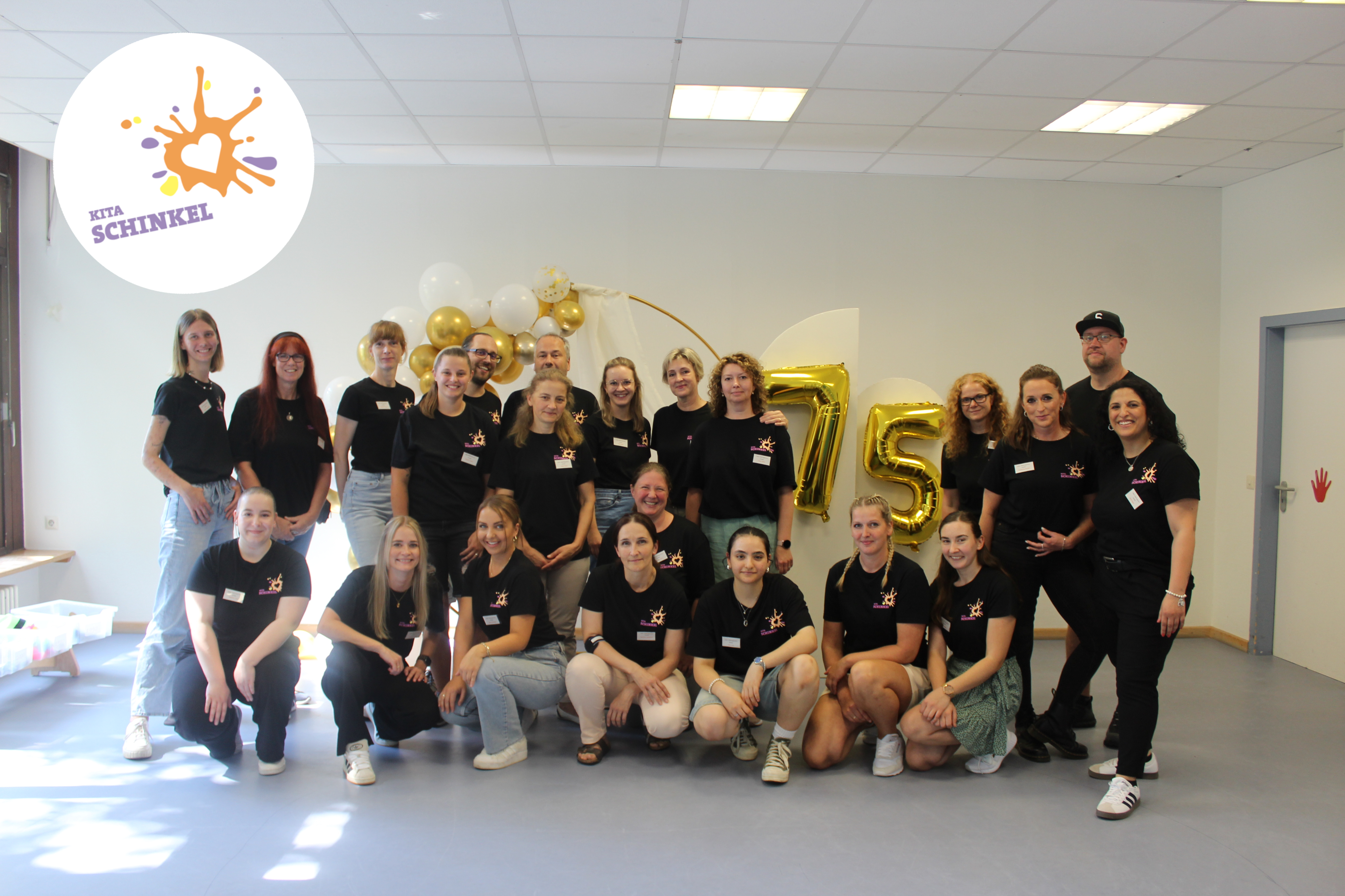 Die Mitarbeitenden der Kita Schinkel feiern das 75-jährige Jubiläum der Einrichtung.
