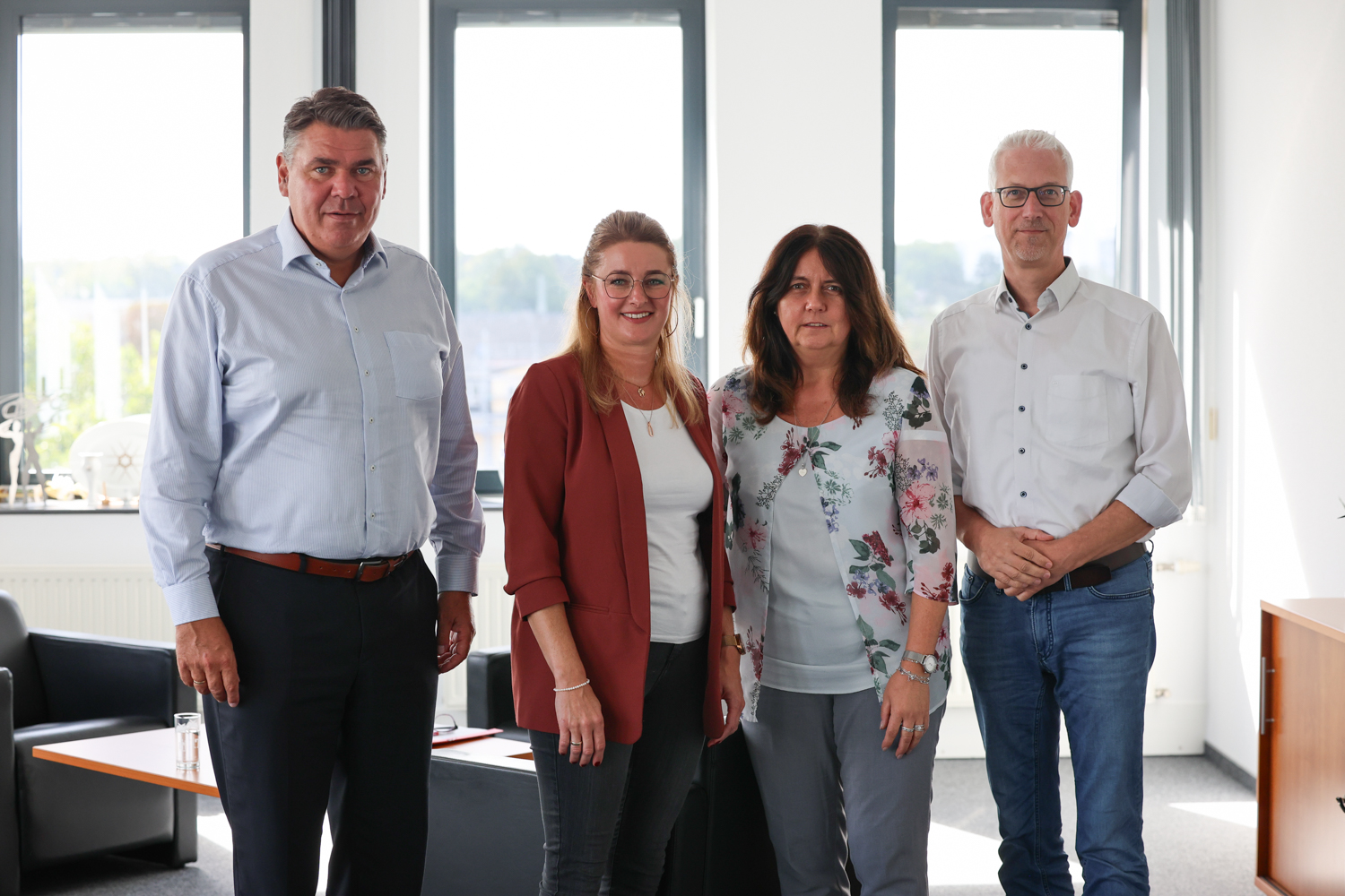 Bildzeile: Von links nach rechts: Landrat Mario Löhr, Tatjana Korba, Fachbereichsleiterin Anja Seeber und Dezernent Torsten Göpfert.