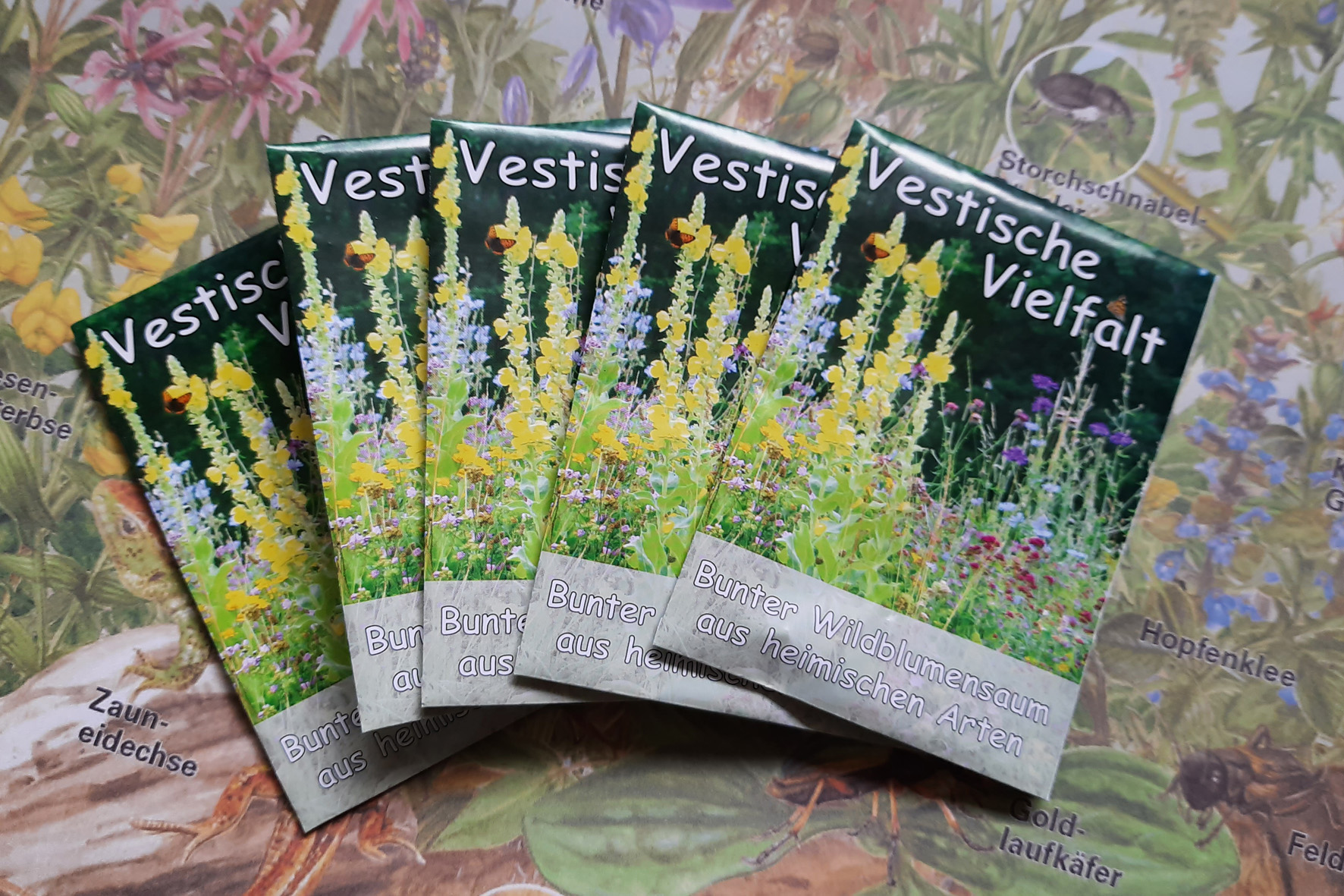 Die Saatgutmischung „Vestische Vielfalt“ mit Gräsern und Kräutern regionaler Herkunft, wurde eigens von der Unteren Naturschutzbehörde beim Kreis Recklinghausen entwickelt und wird ab sofort im Hertener Rathaus und beim Zentralen Betriebshof kostenfrei ausgegeben.