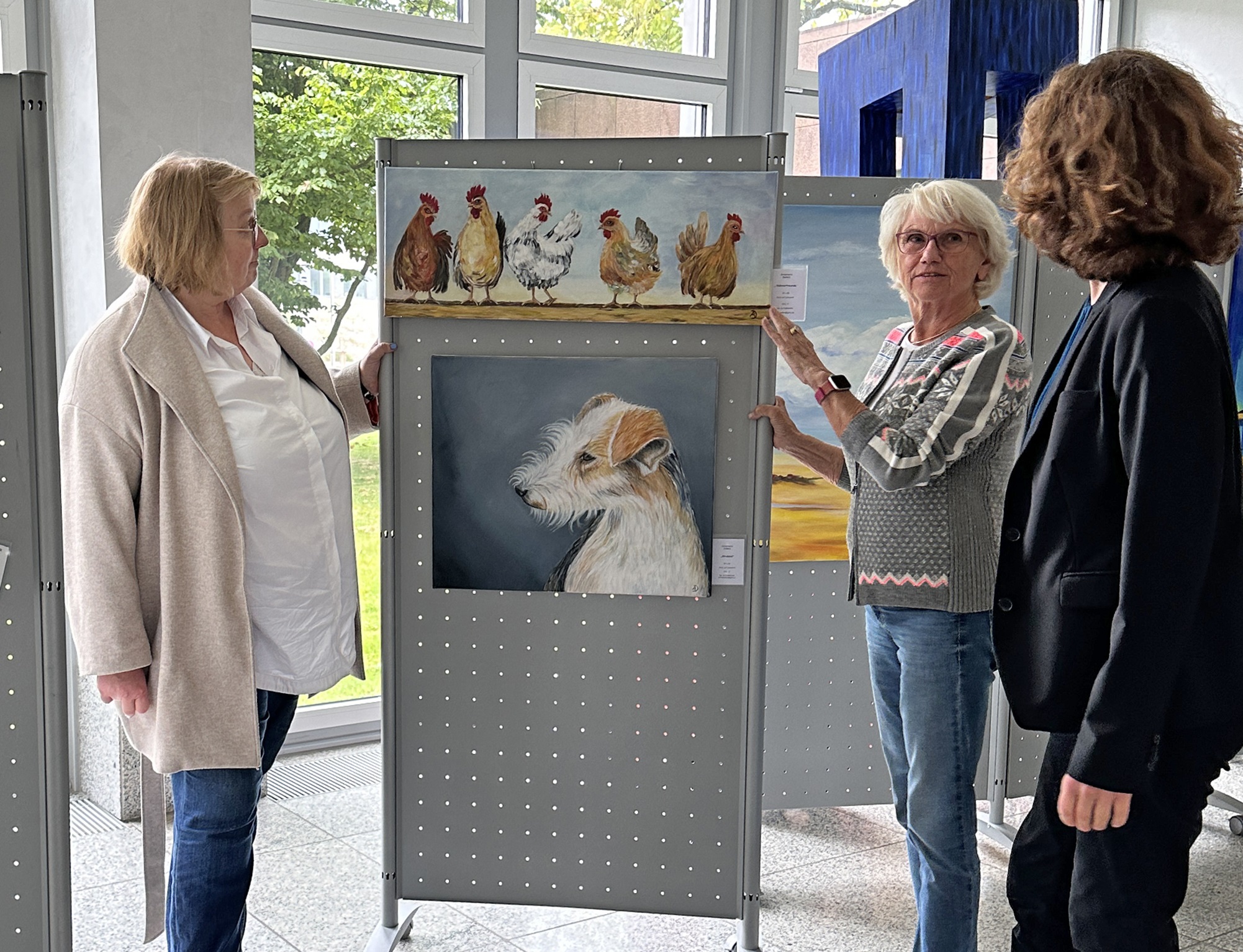 Monika Olschewski aus Rheine (l.) und Annemarie Deiters aus Steinfurt führen Kreis-Kulturmanagerin Kristina Dröge (r.) durch die Ausstellung.