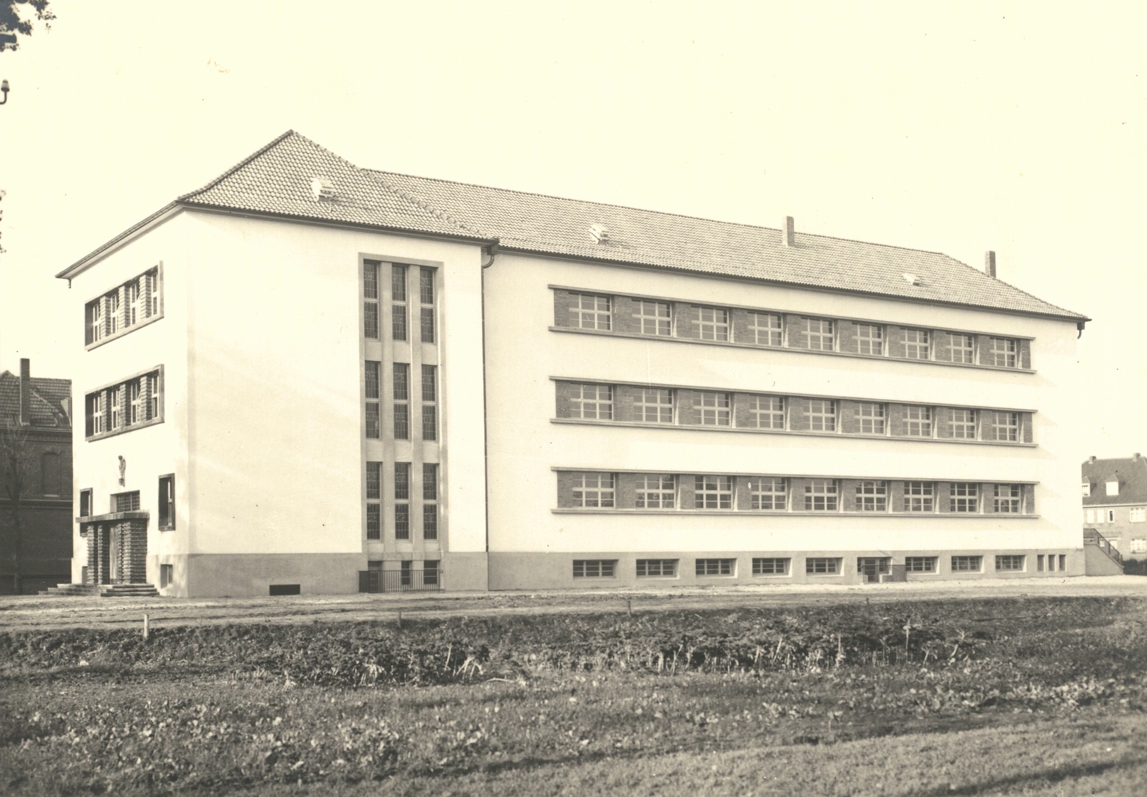 Die neue Volksschule an der Münsterstraße um 1930. Links das alte Schulgebäude von 1898, rechts ein Wohnhaus an der Reygersstraße.
