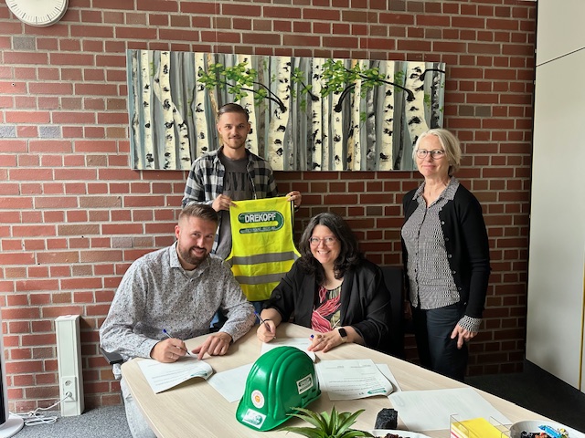 Freuen sich über die Bildungspartnerschaft: Philipp Kayma, Personalleiter Drekopf, dahinter Herr Walter, Azubi bei Drekopf, Ilka Wandelt, Schulleitung Gustav-Heinemann-Gesamtschule und Petra Runz, Abteilungsleitung Kl. 8-10 (v.l.).