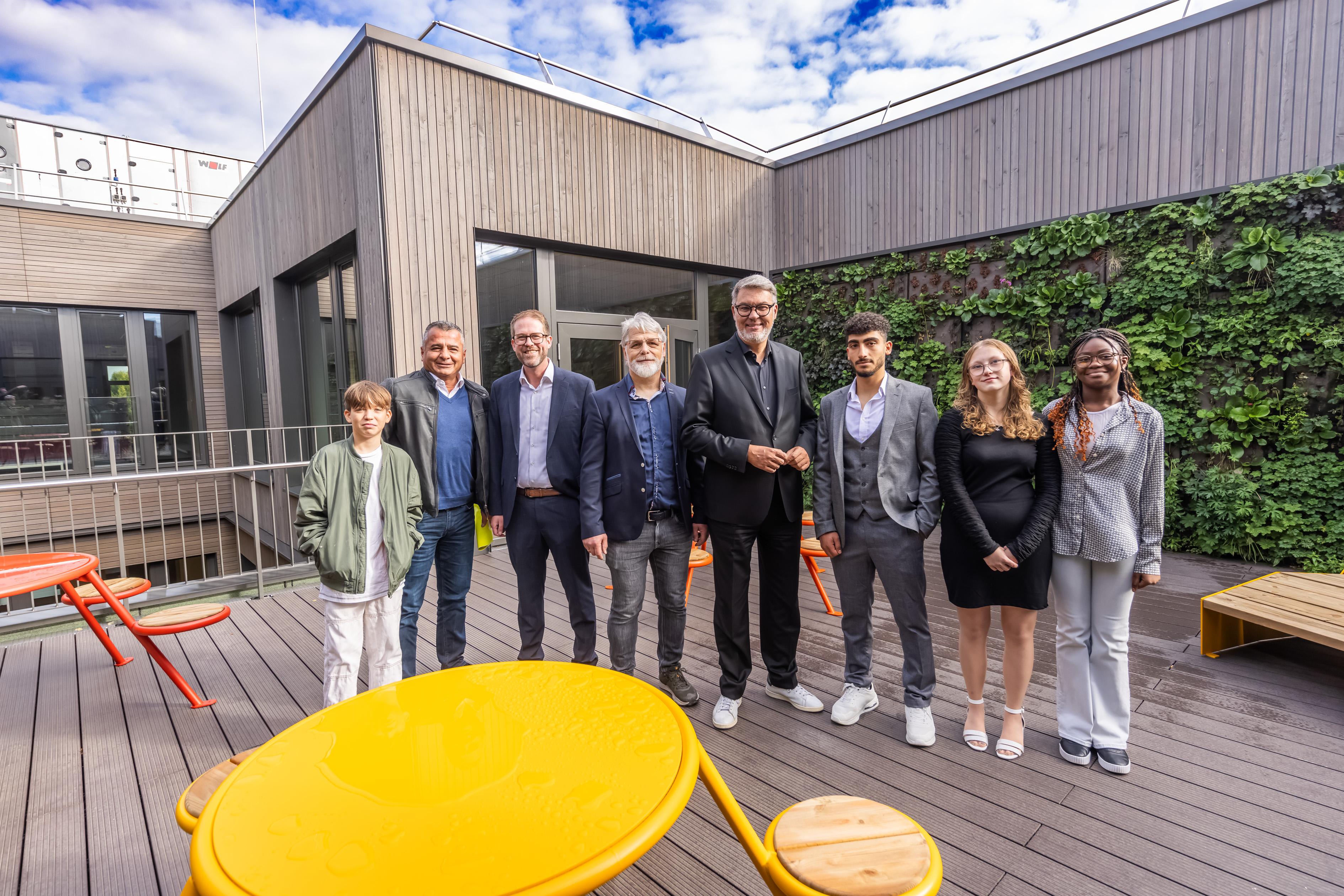 Lasse Prinz (7d), Ahmet Gönen, stellvertretender Amtsleiter Immobilienwirtschaft, Schulamtsleiter Dennis Neumann, Schulleiter Christian Pätzold, Oberbürgermeister Thomas Westphal, Mohamad Abou Shanab (Schülersprecher, 10b), Lucy Diepenbrock (stellv. Schülersprecherin, 10b) und Leanne Yanful (7d/v.l.) auf der Dachterrasse der Erweiterungsbaus.