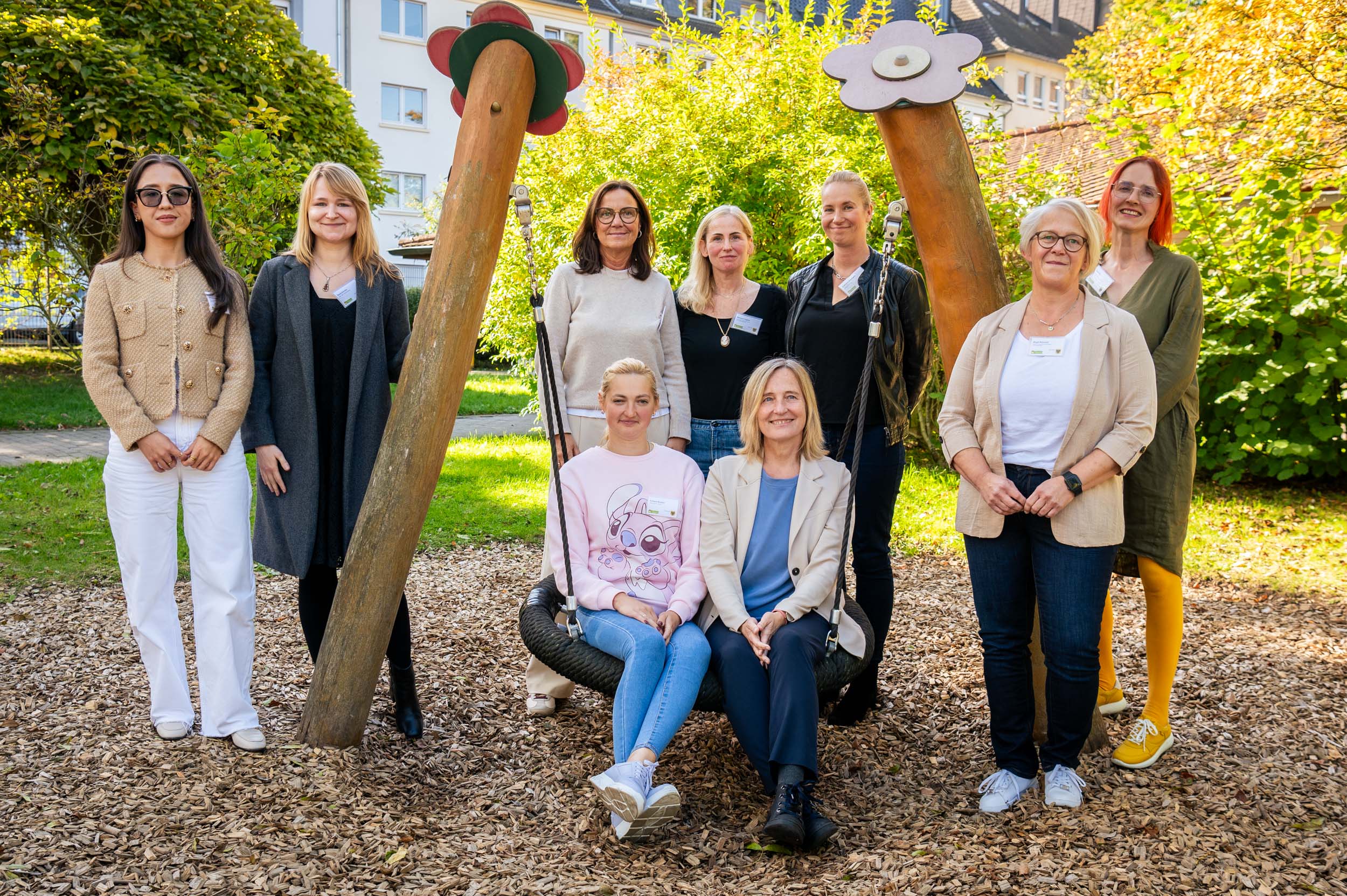 Gruppenfoto mit Vertretern aller beteiligten Institutionen (v.l.): Mushtaryi Mamadalieva, die für das Projekt zuständige pädagogische Mitarbeiterin bei der Volkshochschule, Senta Schultze, stellvertretende Abteilungsleiterin bei der VHS, Corinna Hoffmann, Jobcenter-Geschäftsführerin Markt & Integration, Startklar-Teilnehmerin Svitlana Bondar, Marzena Trajdos, Leiterin der Tageseinrichtungen Fliederstraße und Uhlandstraße 170, Monika Nienaber-Willaredt, Dezernentin für Schule, Jugend und Familie, Katharina Bräutigam (Teamleitung Personalentwicklung FABIDO), Birgit Reinhold, FABIDO Projektleitung Startklar und Kita-Einstieg, Saskia Hinz, Beauftrage für Chancengleichheit der Agentur für Arbeit.