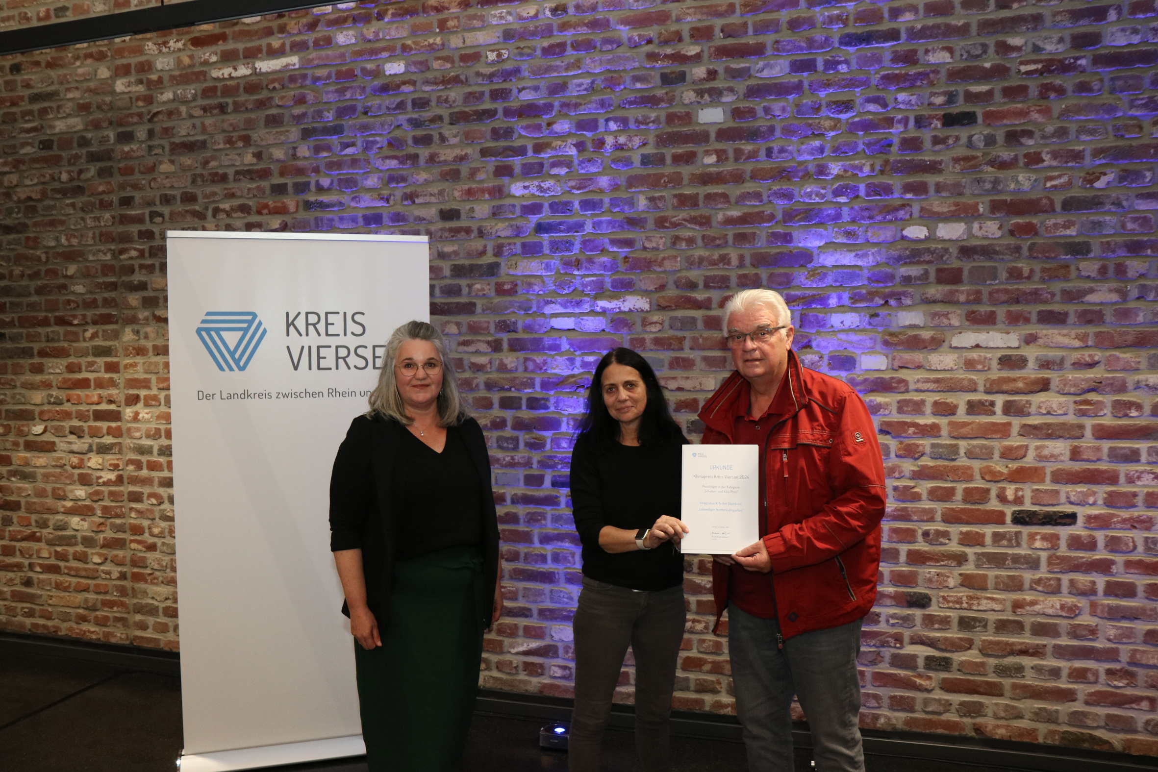 Schulen- und Kita-Preis für „Lebendiger, bunter Lehrgarten“ von Integrative Kita am Steinkreis: Laudatorin Katja Schulte (Kreis Viersen), Michaela Castor und Herr Wüsten.
