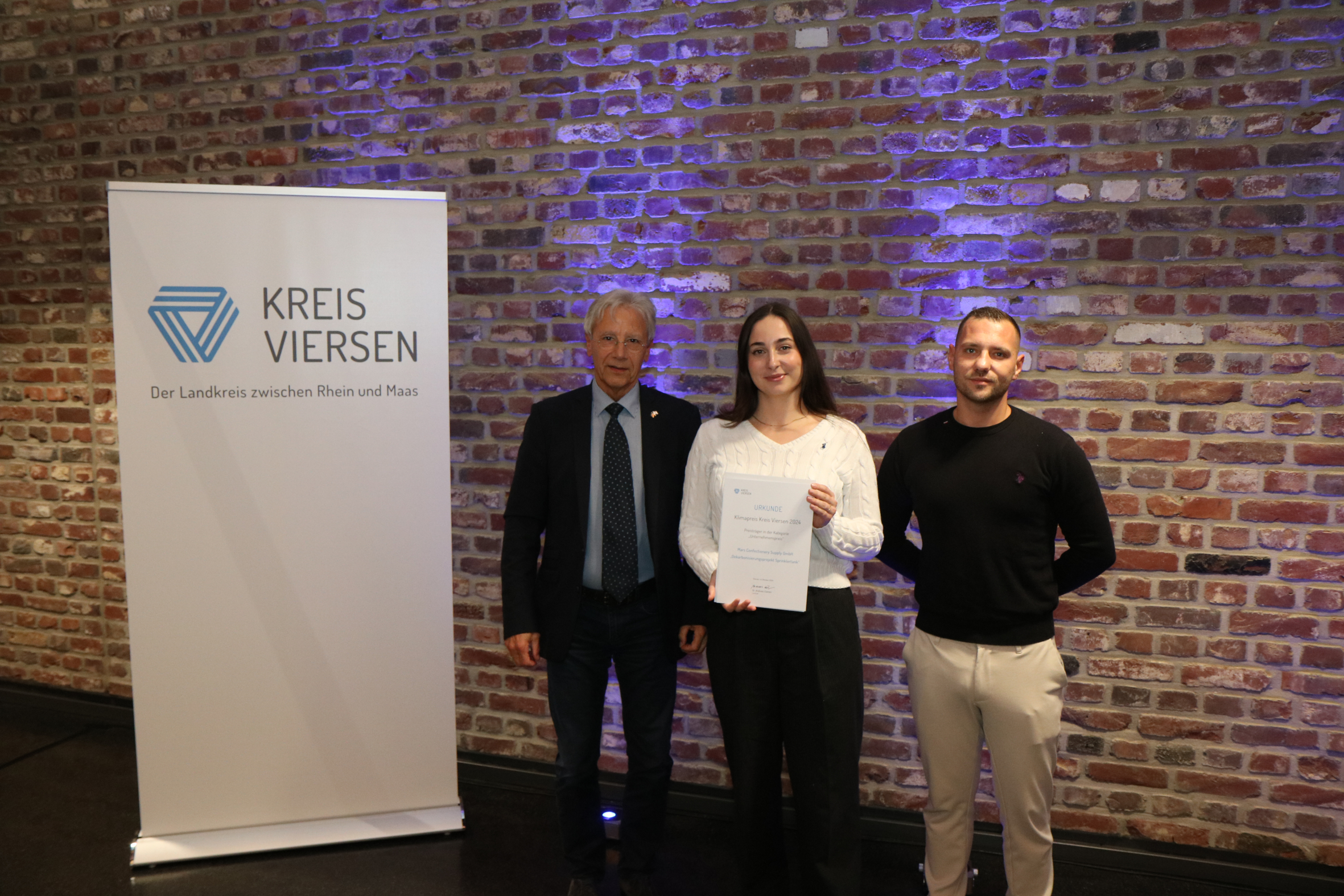 Unternehmenspreis für „Dekarbonisierungsprojekt Sprinklertank“ der Mars Confectionery Supply GmbH: Laudator Rainer Röder (Kreis Viersen), Bea Kapic und Alessandro Blanda.