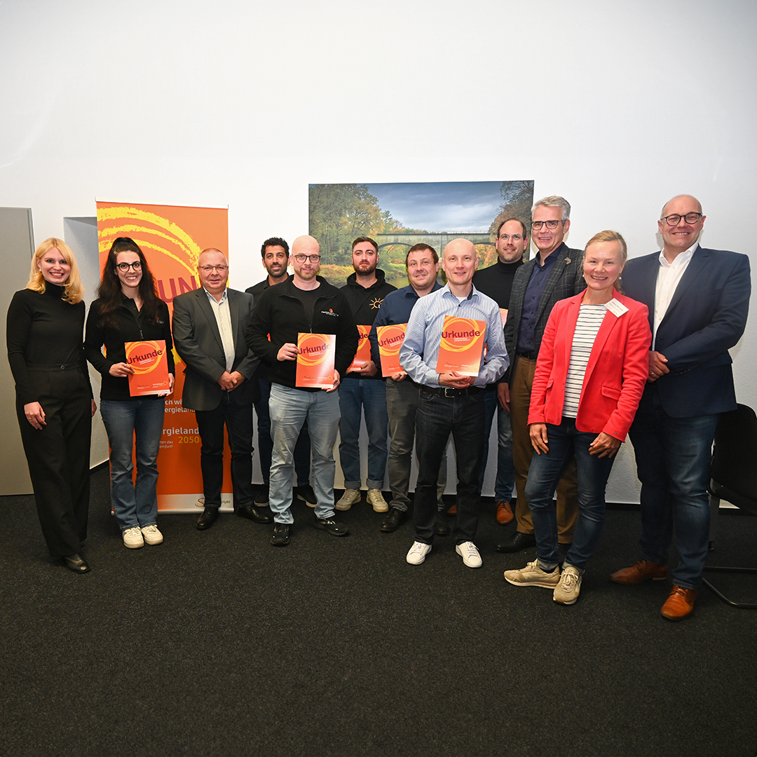 Der stellvertretende Vereinsvorsitzende Christoph Eckelmeier (3.v. links) und die stellvertretende Geschäftsführerin Claudia Franca Machado (links) freuen sich, sieben neue Unternehmensmitglieder im energieland2050 e.V. begrüßen zu dürfen.