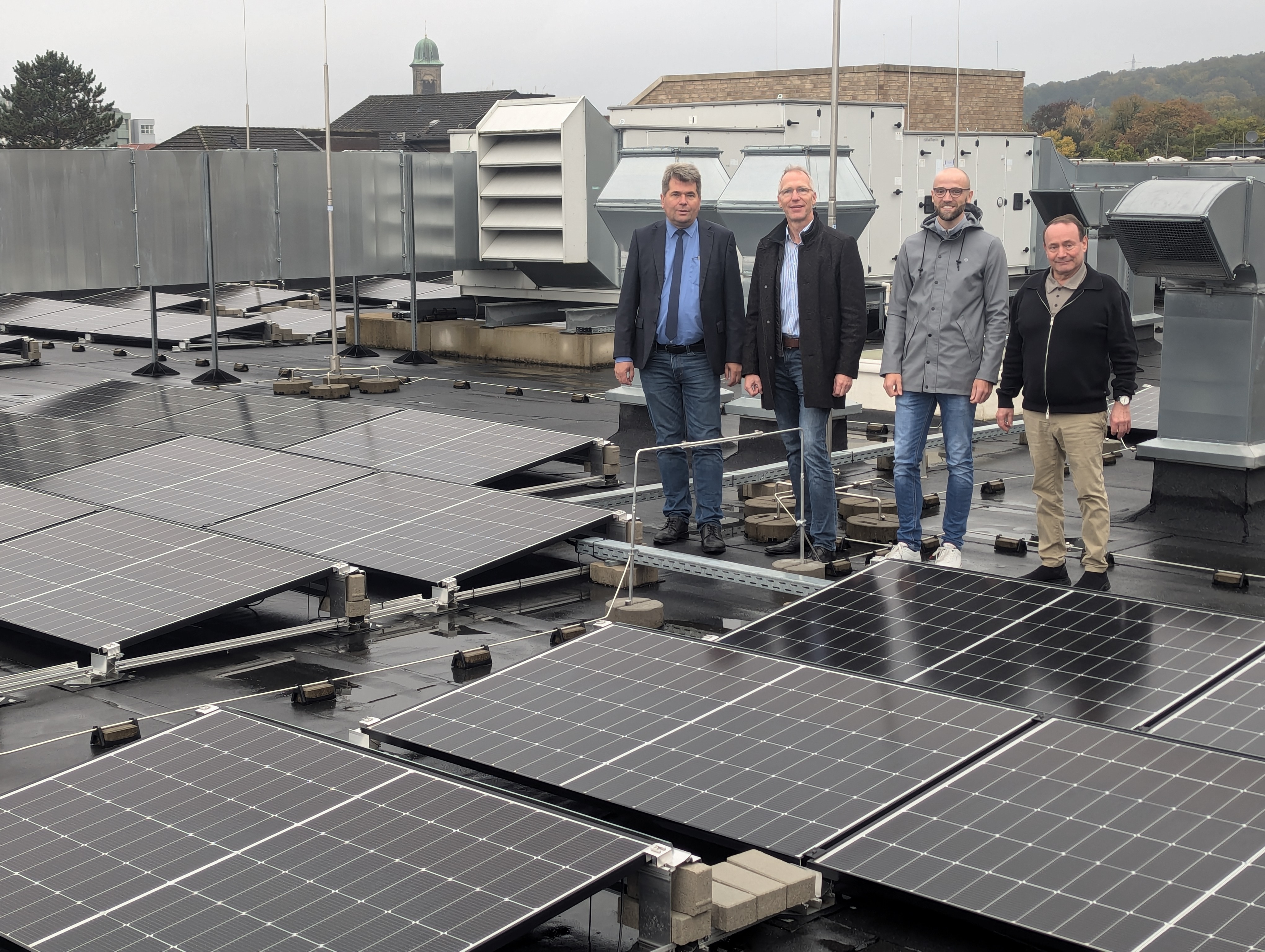 Zufrieden mit dem Ergebnis (v. l.): Aufsichtsratsvorsitzender und Kreisbaudirektor Carsten Rehers, Vorstandsmitglied Sven Kiesow, Christopher Schwering von der technischen Gebäudewirtschaft des Kreises sowie Schulleiter Christian Schneider bei der Besichtigung der PV-Anlage auf dem Berufskolleg Tecklenburger Land.