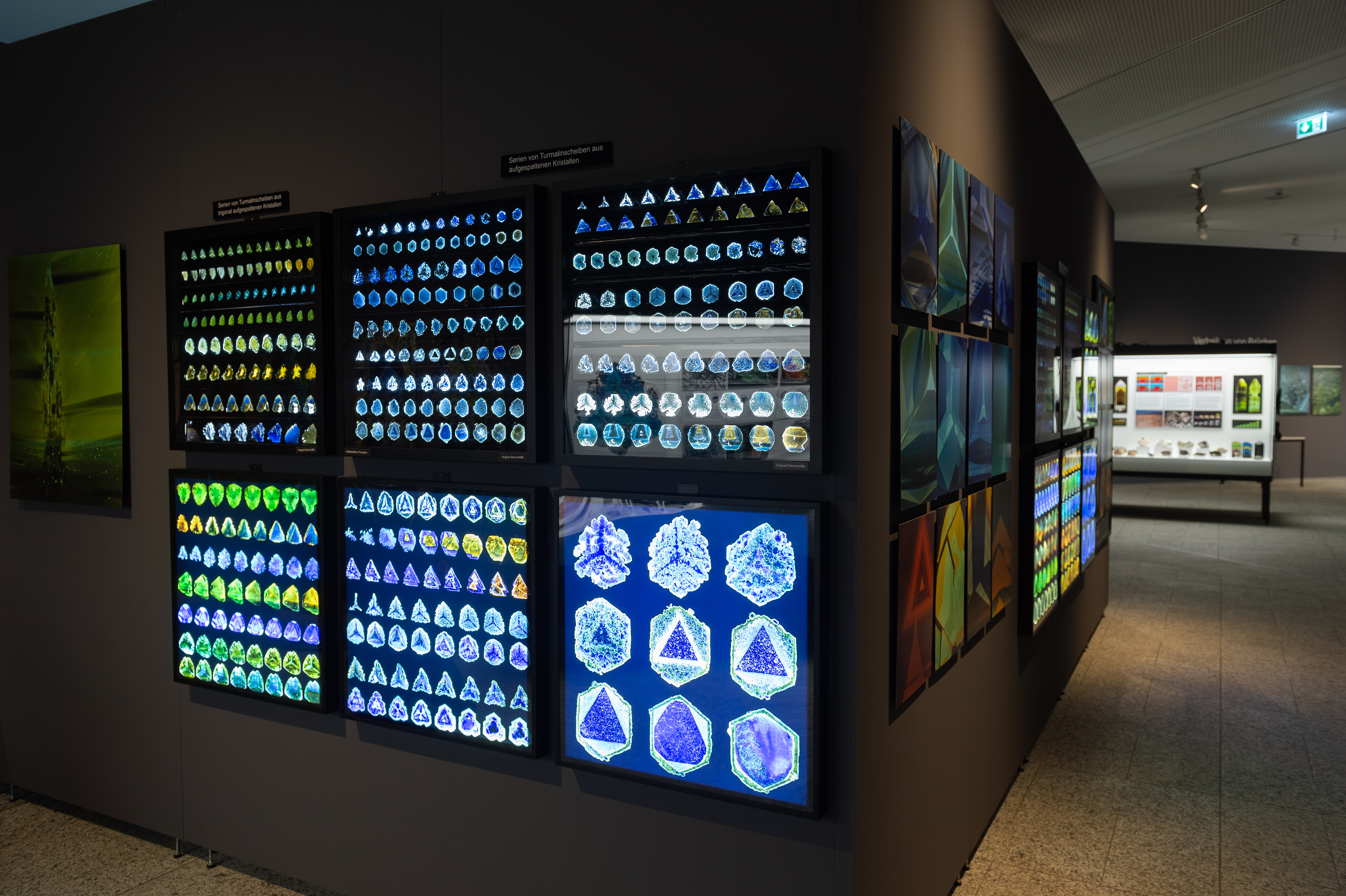Die Ausstellung im Naturmuseum Dortmund zeigt beleuchtete Turmalin-Kristallscheiben, die faszinierende Farb- und Formwelten offenbaren.