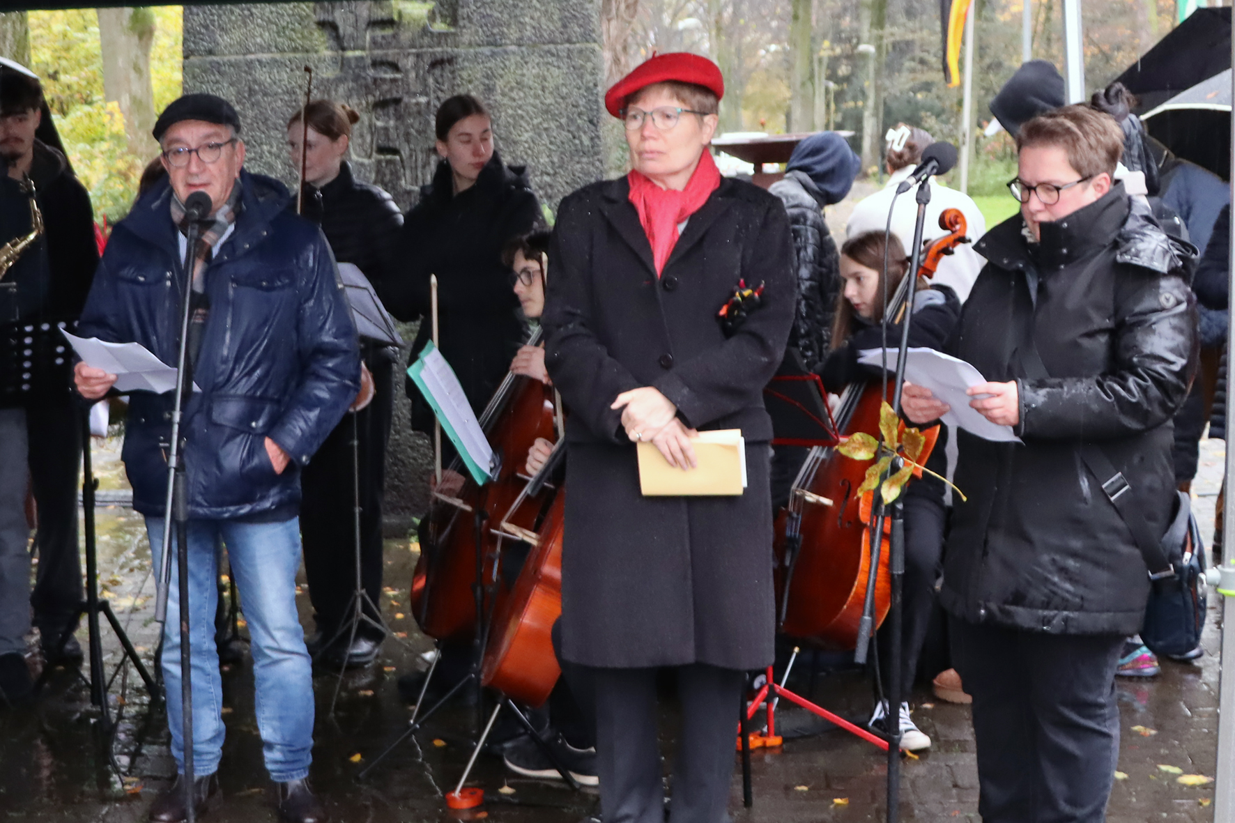 Jürgen Hoffmann (v.l.), Dr. Babette Nieder und Christa Vanselow tragen in enger Verbundenheit zu den drei Hertener Partnerstädten Szczytno, Arras und Doncaster das Gedicht „Krieg dem Kriege“ von Kurt Tucholsky vor. (Foto: Stadt Herten_Marco Baron)