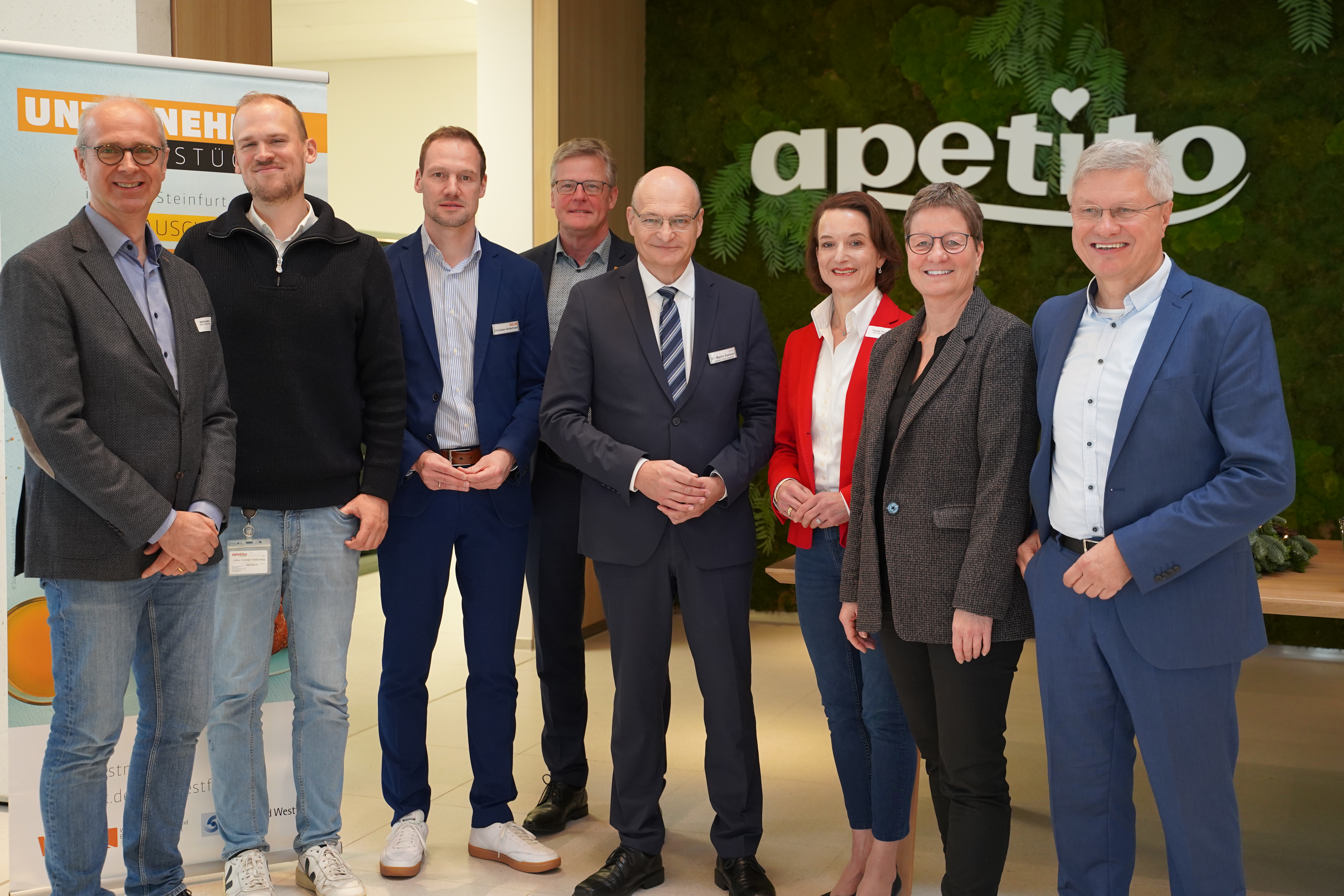 Freuten sich über den guten Austausch zum Thema Nachhaltigkeit beim 37. kreisweiten Unternehmerfrühstück (v.l.): Matthias Martin (stellvertretender Vorsitzender des IHK-Regionalausschusses für den Kreis Steinfurt), Julius Holdschlag (Nachhaltigkeitsmanager apetito AG), Christian Holterhues (Geschäftsführer WESt), Dr. Peter Lüttmann (Bürgermeister Rheine), Landrat Dr. Martin Sommer, Frauke Thole (Vorstandsmitglied WVS Steinfurt), Ruth Fislage (Leitung Unternehmenskommunikation und PR apetito AG) und Klaus Ludmann (Geschäftsführer der apetito Kids & Schools KG).