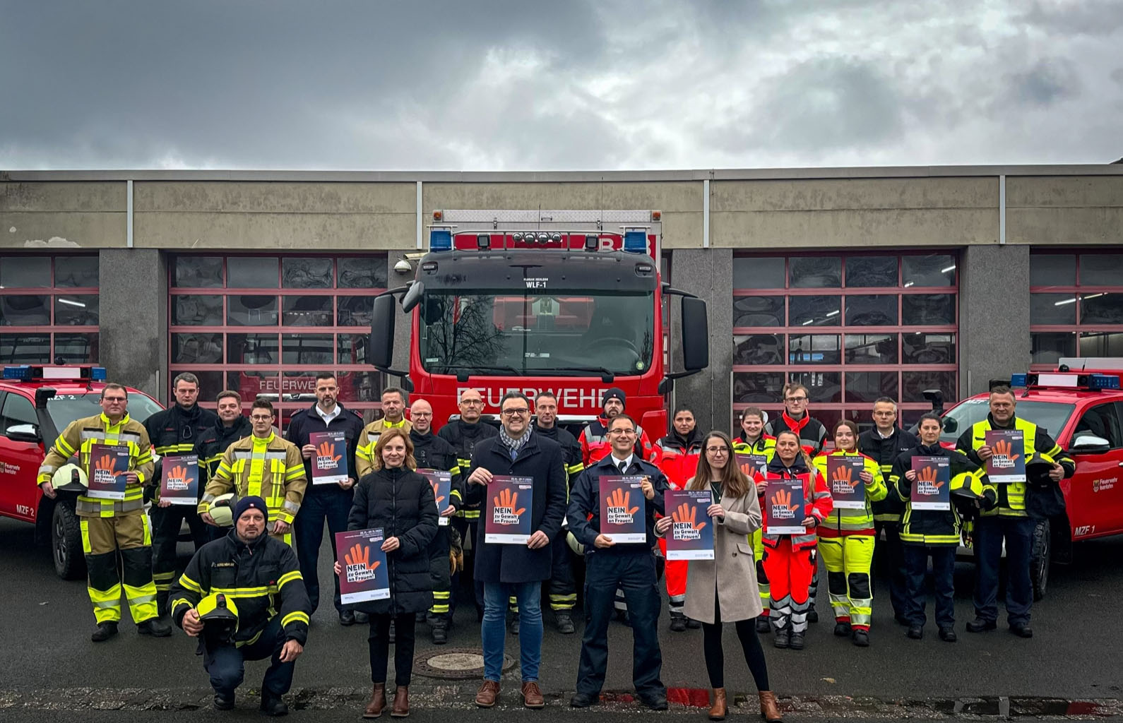 In einer gemeinsamen Aktion zum Internationalen Tag gegen Gewalt an Frauen machen Bürgermeister Michael Joithe, Einsatzkräfte der Feuerwehr Iserlohn und des Rettungsdienstes sowie die städtische Gleichstellungsstelle auf das Thema aufmerksam.