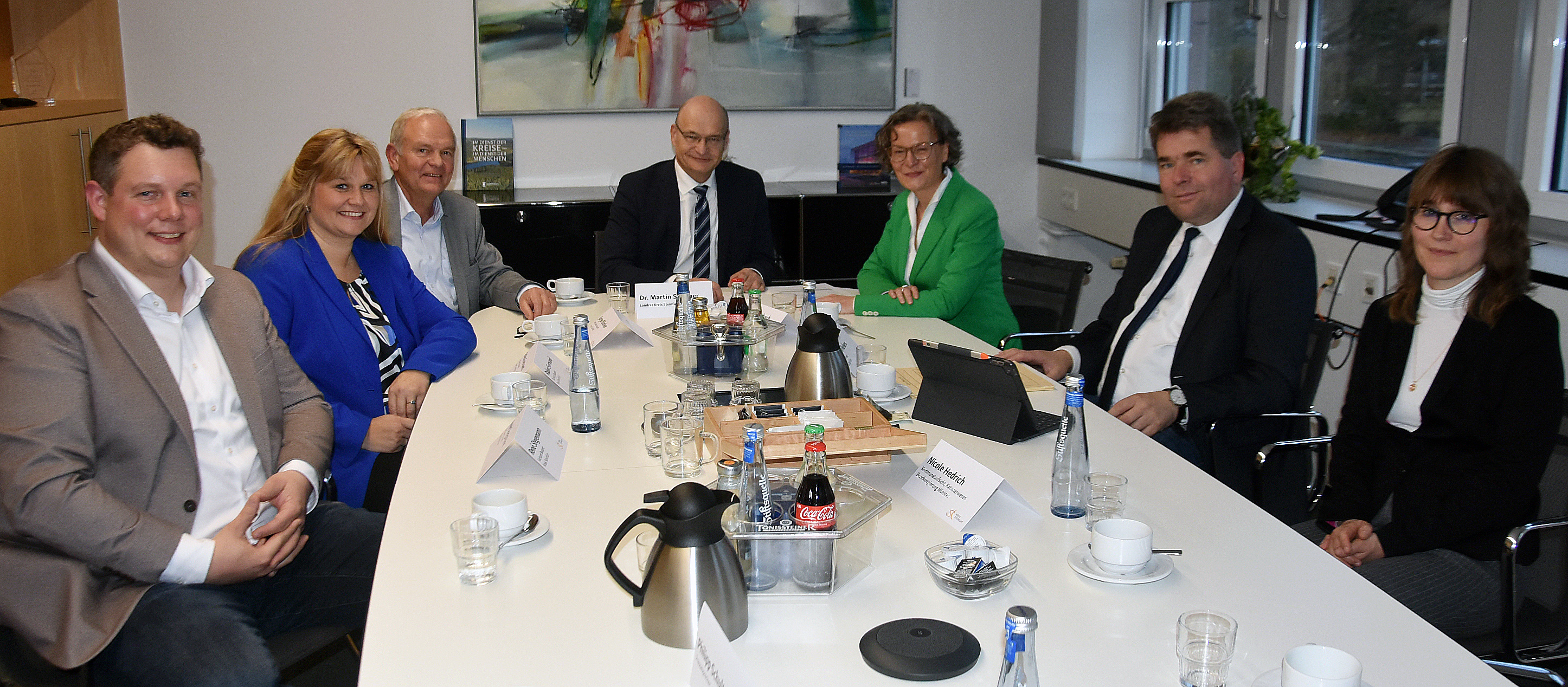 Freuen sich über die Förderung des Modellprojekts mit Vorbildcharakter (v. l.): Rene Stegemann (neue Untere Denkmalbehörde), Rabea Everwand (Obere Denkmalbehörde und Leiterin des interkommunalen Pilotprojekts), Jürgen Blömker (Kreisbauamtsleiter), Landrat Dr. Martin Sommer, NRW-Ministerin für Heimat, Kommunales, Bau und Digitalisierung, Ina Scharrenbach, Carsten Rehers (Kreisbaudezernent) und Nicole Hedrich (Sachbearbeiterin Förderung interkommunale Zusammenarbeit bei der Bezirksregierung Münster).