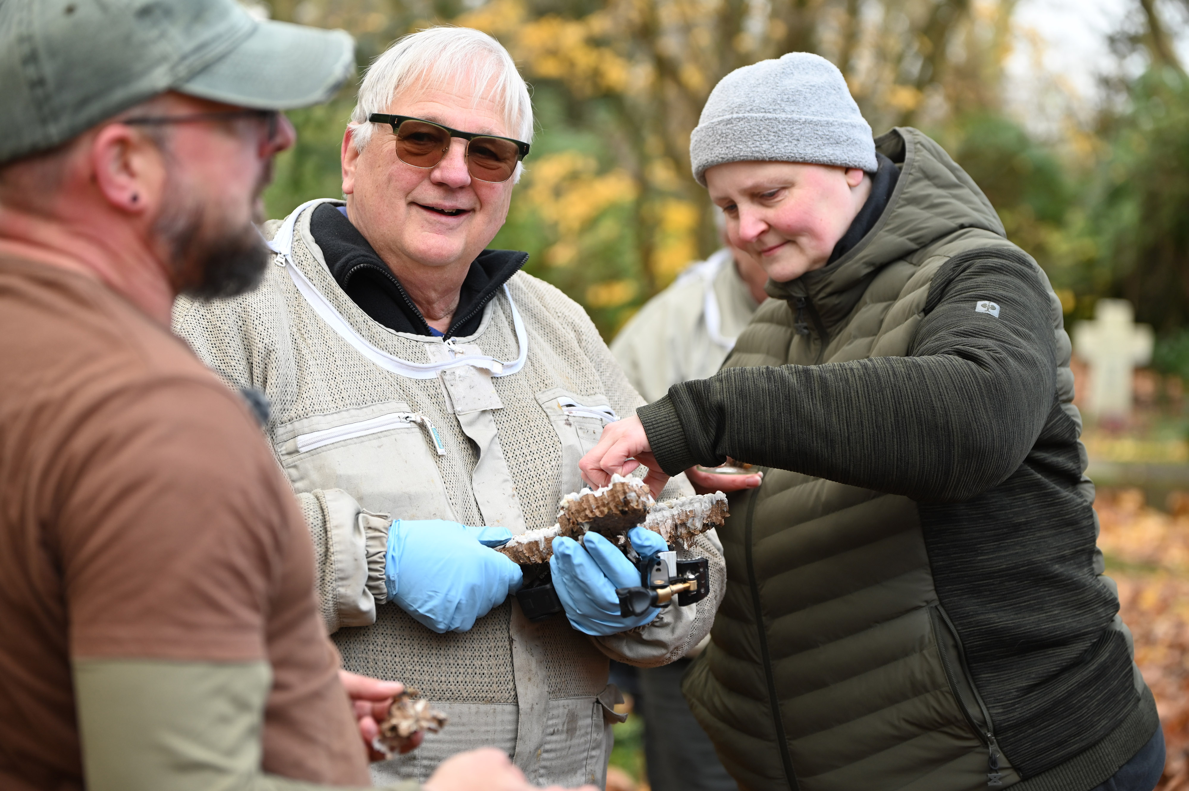 Uwe König (M.) vom Kreisimkerverein Dortmund schaut sich gemeinsam mit Thomas Beißel und Esther Saalmann (r.), ebenfalls Kreisimkerschaft, das Innenleben des aufgespürten Nests an.