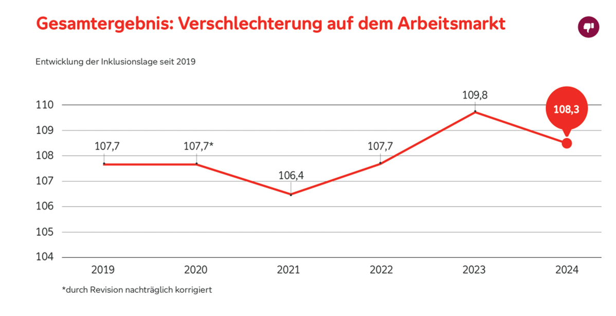 Ein Ergebnis aus dem kürzlich veröffentlichten Inklusionsbarometer Arbeit der Aktion Mensch: Die Entwicklung der Inklusionslage seit 2019.
