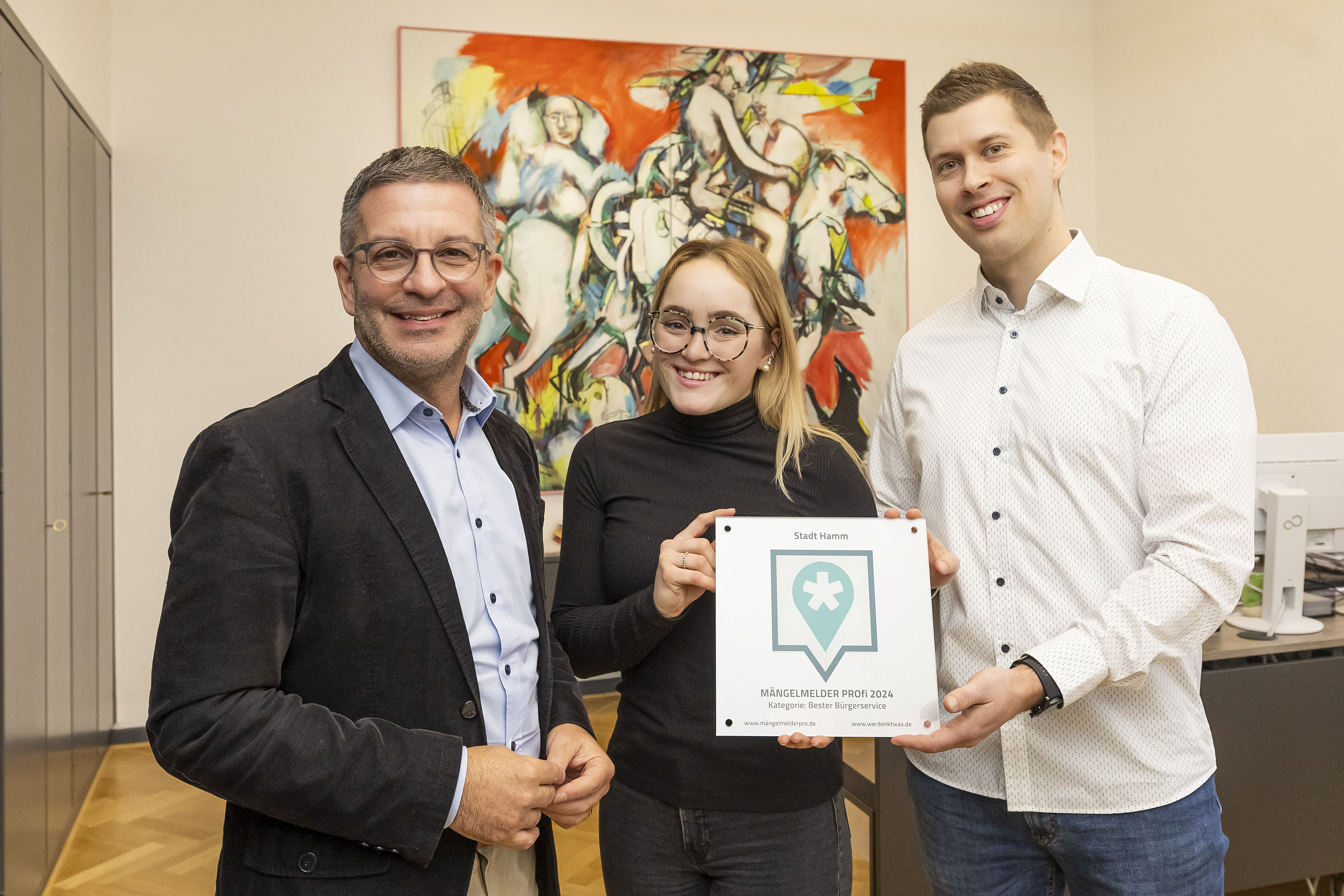 Oberbürgermeister Marc Herter, Anna Quos und Dennis Ritter (beide bei der Stadt verantwortlich für Sags Hamm), freuen sich über die Auszeichnung in der Kategorie "Bester Bürgerservice".