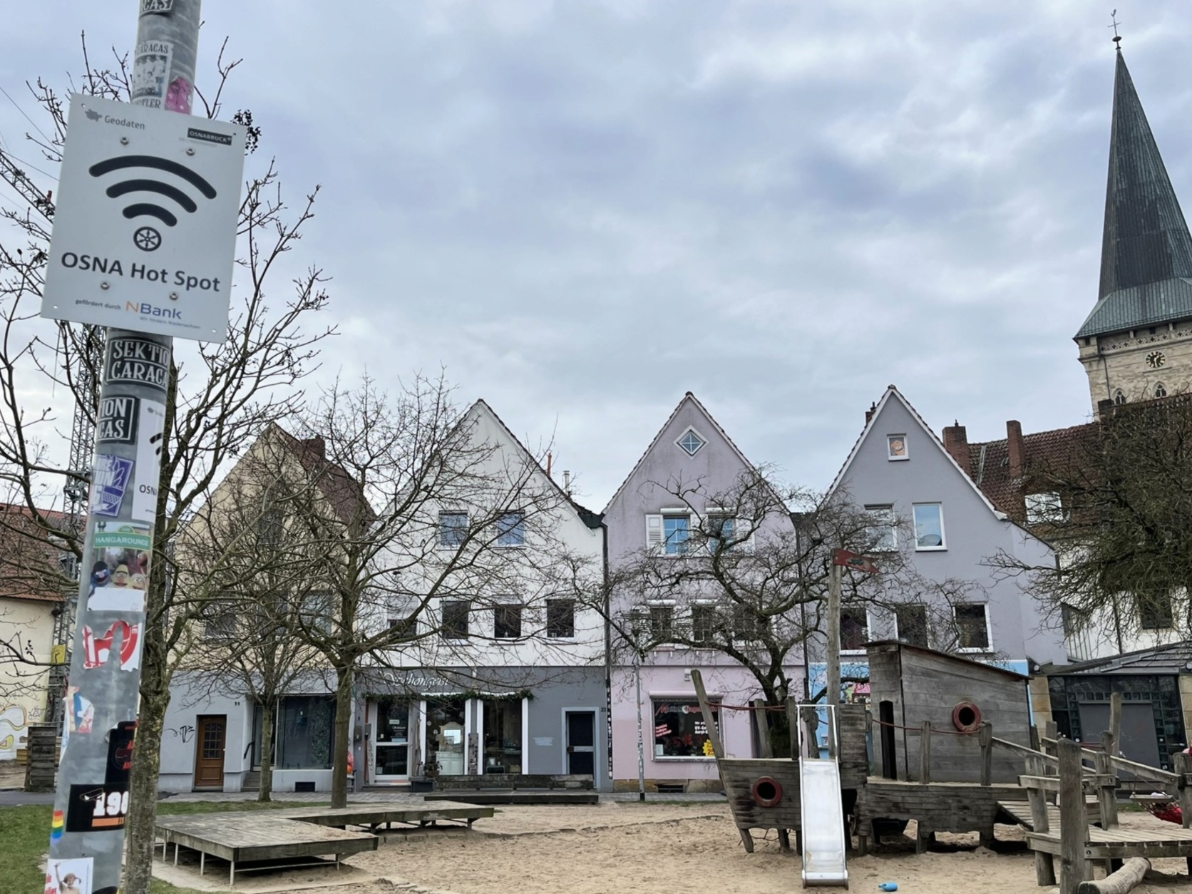 An 22 Standorten in der Osnabrücker Innenstadt bietet die Stadt Osnabrück seit März 2024 kostenloses WLAN an. Wie hier am Adolf-Reichwein-Platz weisen Hinweisschilder oder Aufkleber auf den Dienst "OSNA Hot Spot" hin.